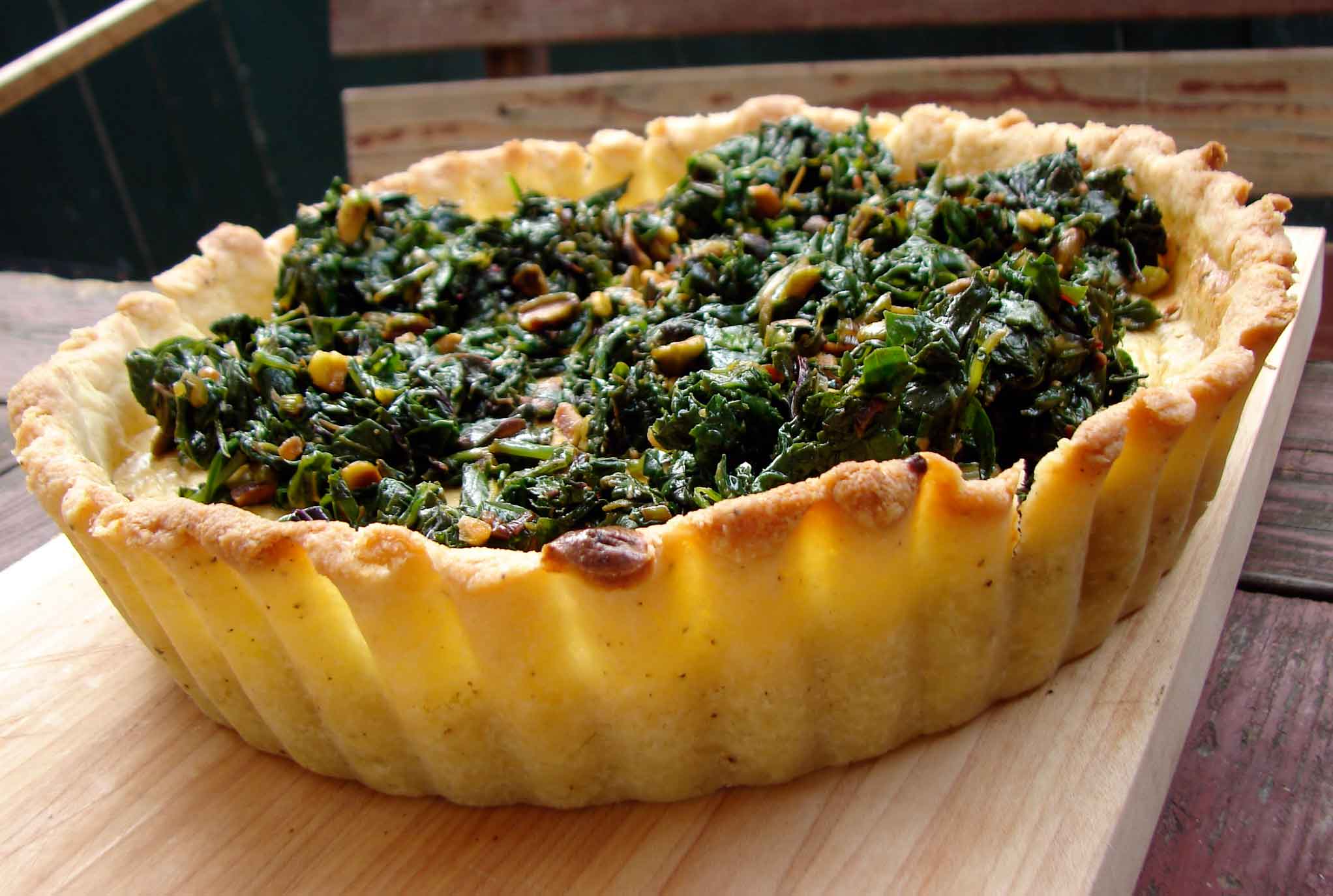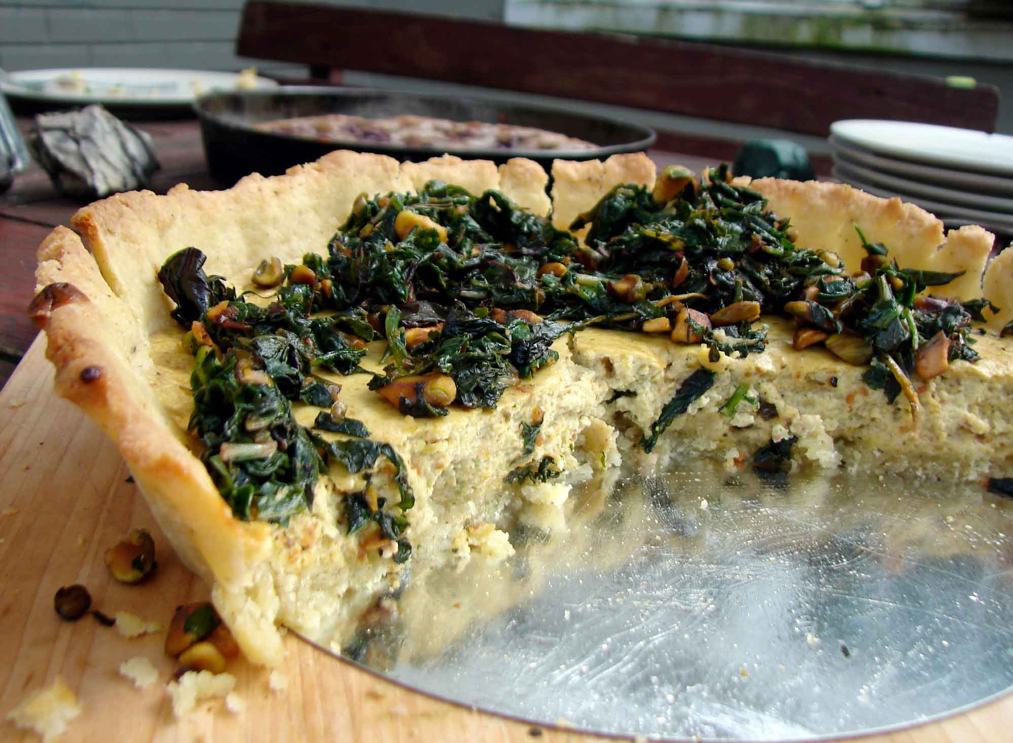 David said this might be his new favorite! I’m very excited about it! For my birthday I got a lovely deep tart pan (thanks mom & dad!). I decided to make a high crust, with a layer of pistachio ricotta custard, and then to sautée some greens and pistachios to pile on top. It worked very well! A nice combination of flavors and textures. You could really taste the pistachios in the custard, which was a treat. The crust is half semolina flour, which makes it very crunchy. I used garlic scapes with the greens, because it’s that time of year, but you could use regular garlic. You could also add tomatoes or olives to the greens if you were feeling fancy. And you could absolutely make this in a normal-sized tart pan or even a cake tin.