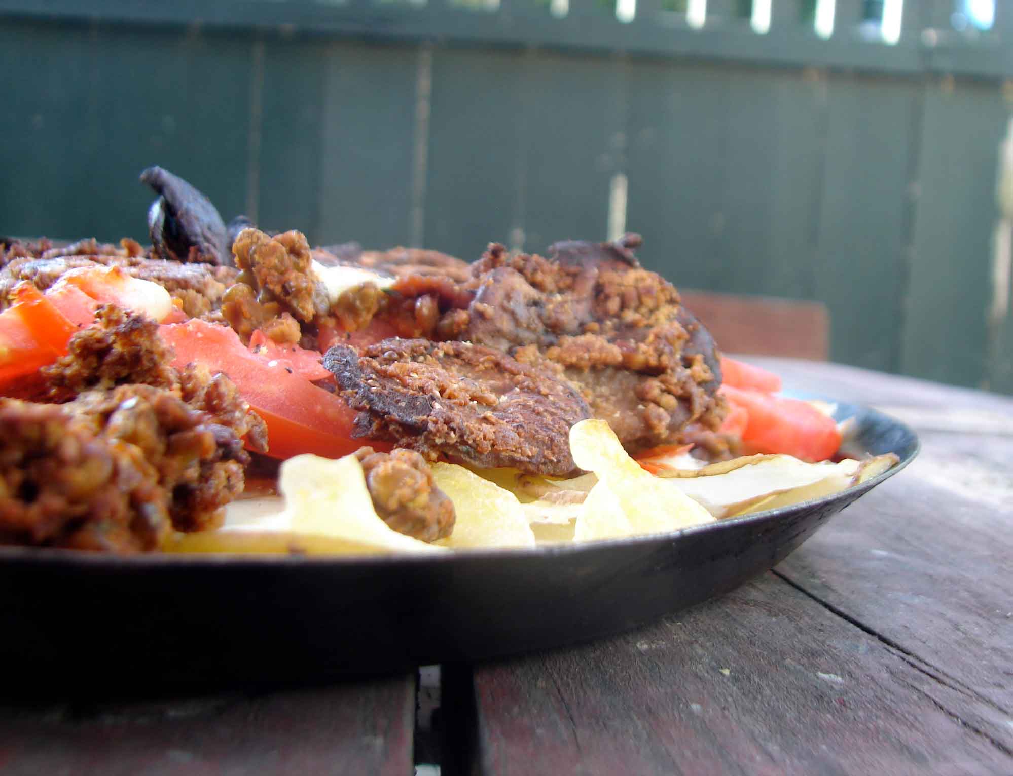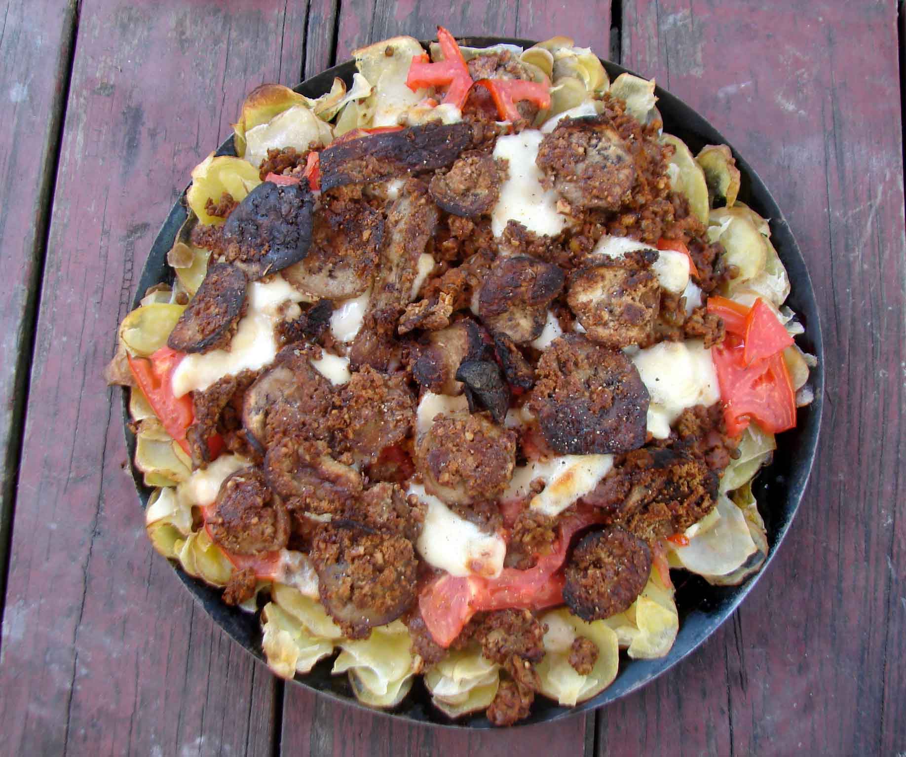 Top the partially baked potatoes with a layer of lentils, then some cheese, then more lentils, then the tomatoes, in a thin layer, then more cheese, and then the eggplant slices.