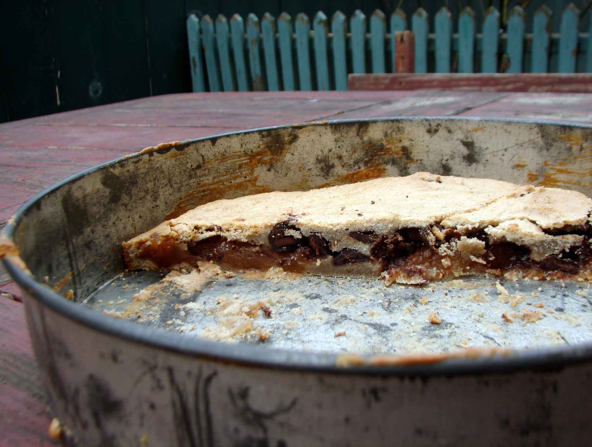 Quinces! I love them! The smell of them, the taste of them, the very idea of them. They’re quite rare around here, and a little pricey, so I always buy very few of them and then save them up till they’re almost past-it, while I wait to think of something special to do with them. This time I decided to make a cake. I cooked the quinces until they were soft. Then I cooked them with sugar, and a bit of clementine zest and juice and some vanilla extract. until they were thick and jammy. I used this, in concert with some bittersweet chocolate chips, as the central layer of a cake with hazelnuts and a bit of sherry. It’s almost like a gateau basque, except that the cake itself is a little different, a little thinner and softer.