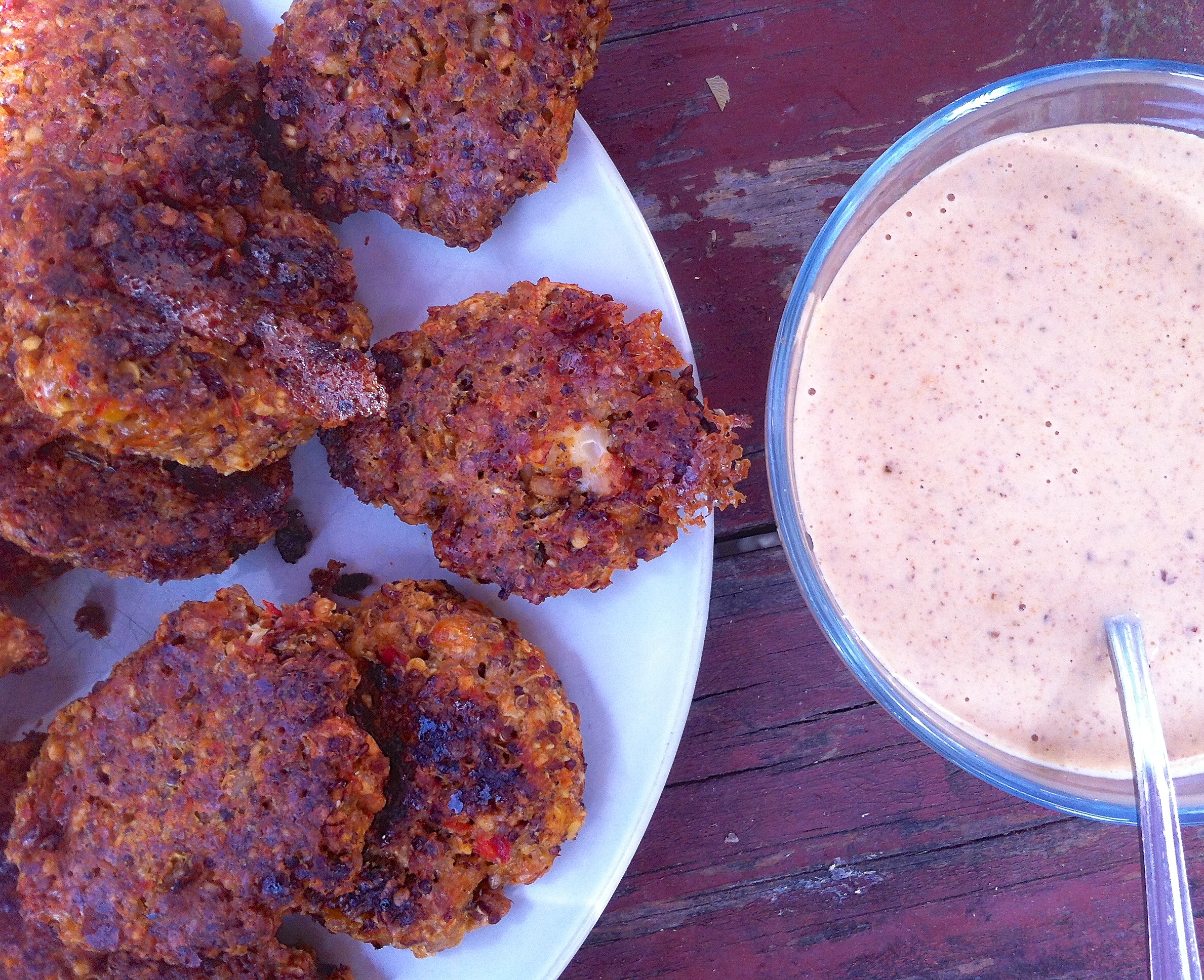 In a food processor process the red peppers briefly until they’re chopped. Add everything else and process until everything is coarse and crumbly and combined. Form into small patties and place on the oiled sheet, turning them over so that both sides get lightly coated with oil.