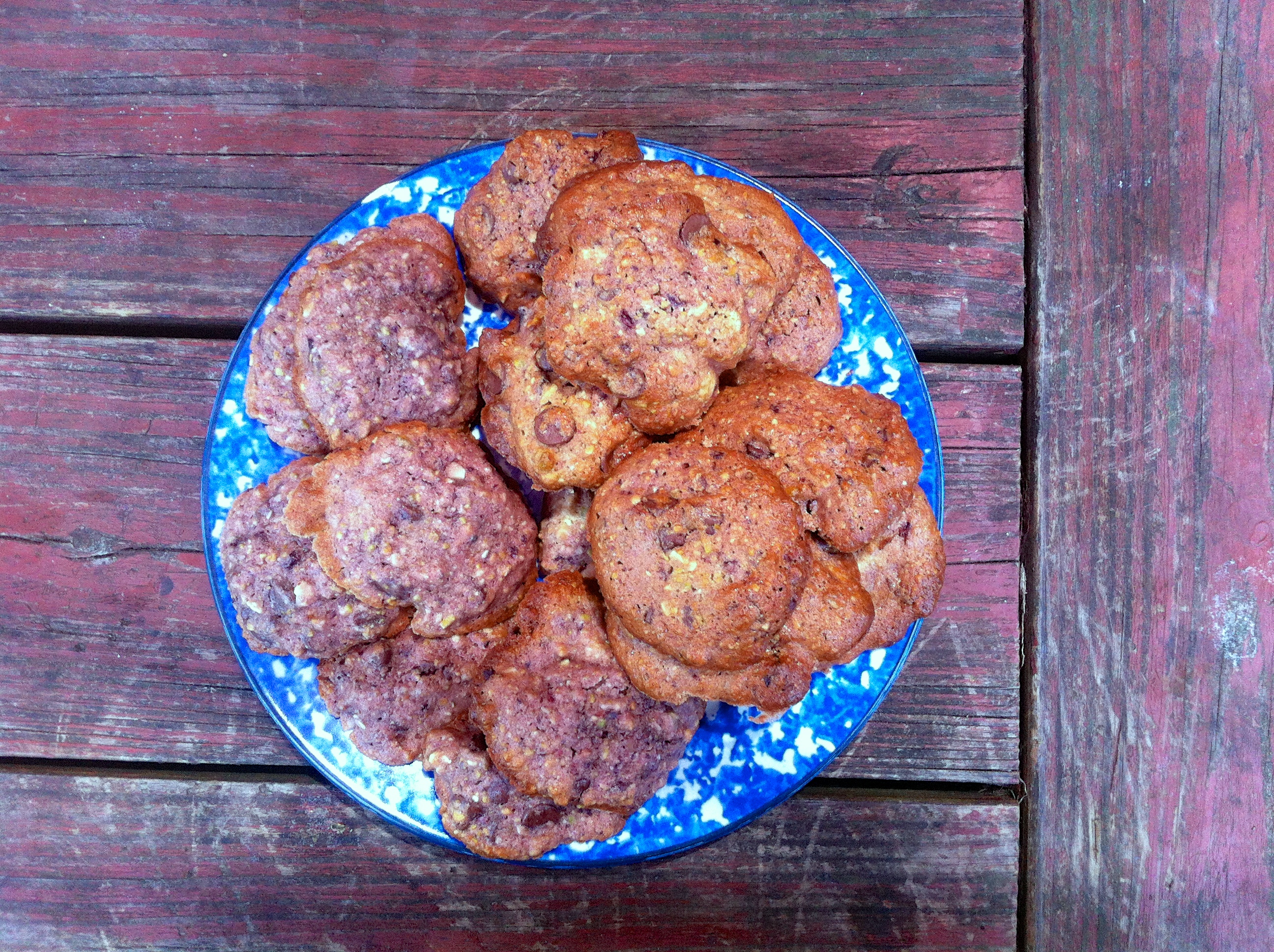 Well, I could go on forever, but I won’t. Instead I’ll tell you about these cookies. David came home from the flea market this morning with a new beautiful blue plate, and he said, “Good for cookies!” So I made cookies. We had some cherries that needed eating, and I always like cherries with pistachios and almonds, and I always like everything with chocolate, so there you have it! I added a little cardamom, because I thought it would go well with everything, and it did. I made quite a small batch…a half batch…because I’m still baking in my toaster oven. So double all of these ingredients if you’re going to make a real batch of cookies! If you cook them till they’re golden on top, they’ll be quite crispy on the outside, but if you stop when they’re just slightly browned on the bottom, they’ll be more soft and chewy. The choice is yours!