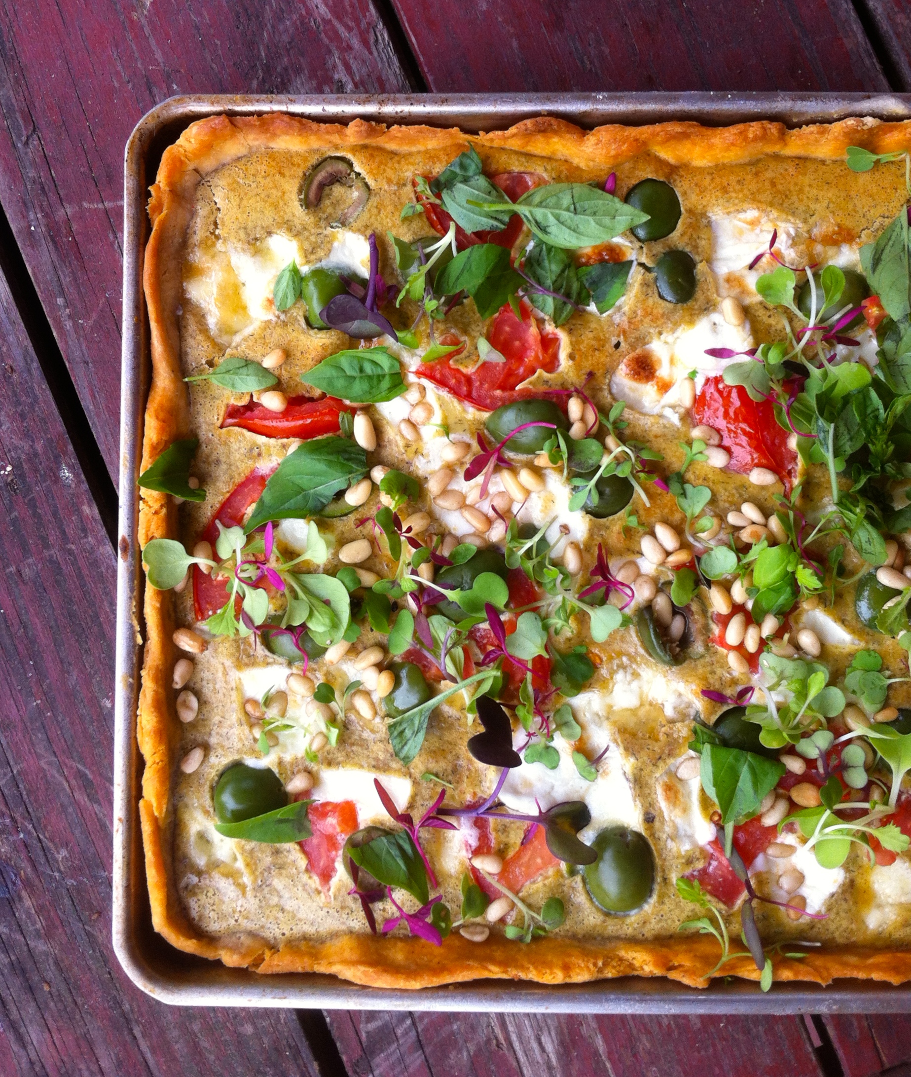 Who is making lots of tarts lately? Who is? ME! I am! I did a ridiculously splurgy grocery shop before my birthday and got brie and pistachios and smoked mozzarella and pine nuts. Phew. So I combined them all in a tart. The crust has smoked paprika in it. The custard has pistachios and goat cheese and bronze fennel leaves. You could use regular fennel leaves of even tarragon, if you’d like to have that lovely anise-lemon flavor. The whole thing is topped with bits of brie, slices of fresh mozzarella, tomatoes, casetlvetrano olives, pine nuts, fresh basil, and these beautiful little spicy shoots that make every picture prettier.Here’s Please Please Please by James Brown.
