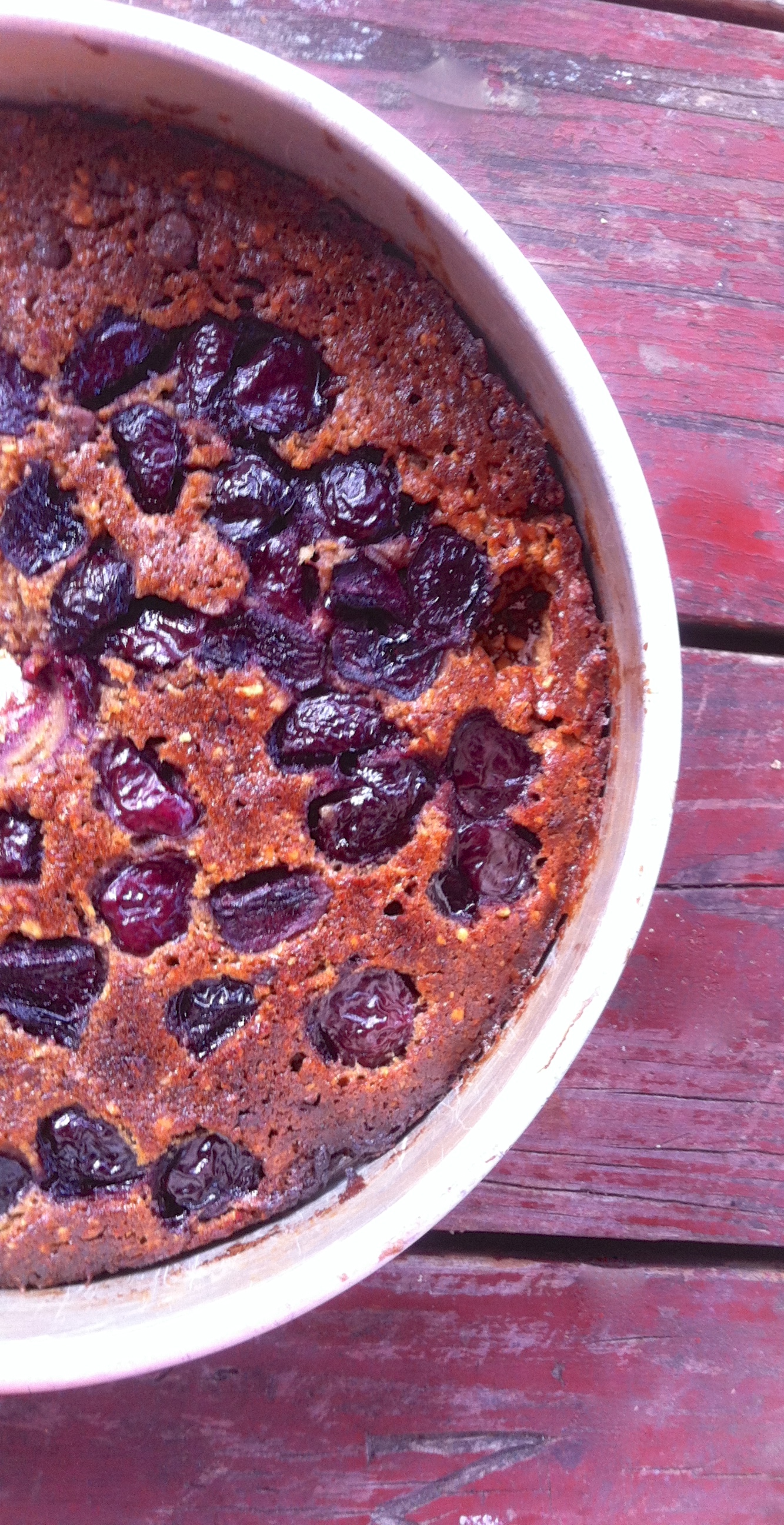 Our blackcurrant bush is bonkers. Full of fruit. You pick a bowlful in the morning, and it’s completely laden again in the evening. The berries seem to ripen as you pick them. So I boiled them for a long time with lots of sugar, and then pressed them through a sieve and ended up with a thick beautiful sauce. I added this to a custard one night and made ice cream. And yesterday I made a cake. I made a soft almond cake, and put a layer of blackcurrant sauce, fresh bing cherries and bittersweet chocolate chips. The whole thing is tart/sweet/soft and juicy. You have to eat it with a fork, though, cause it’s delightfully messy.