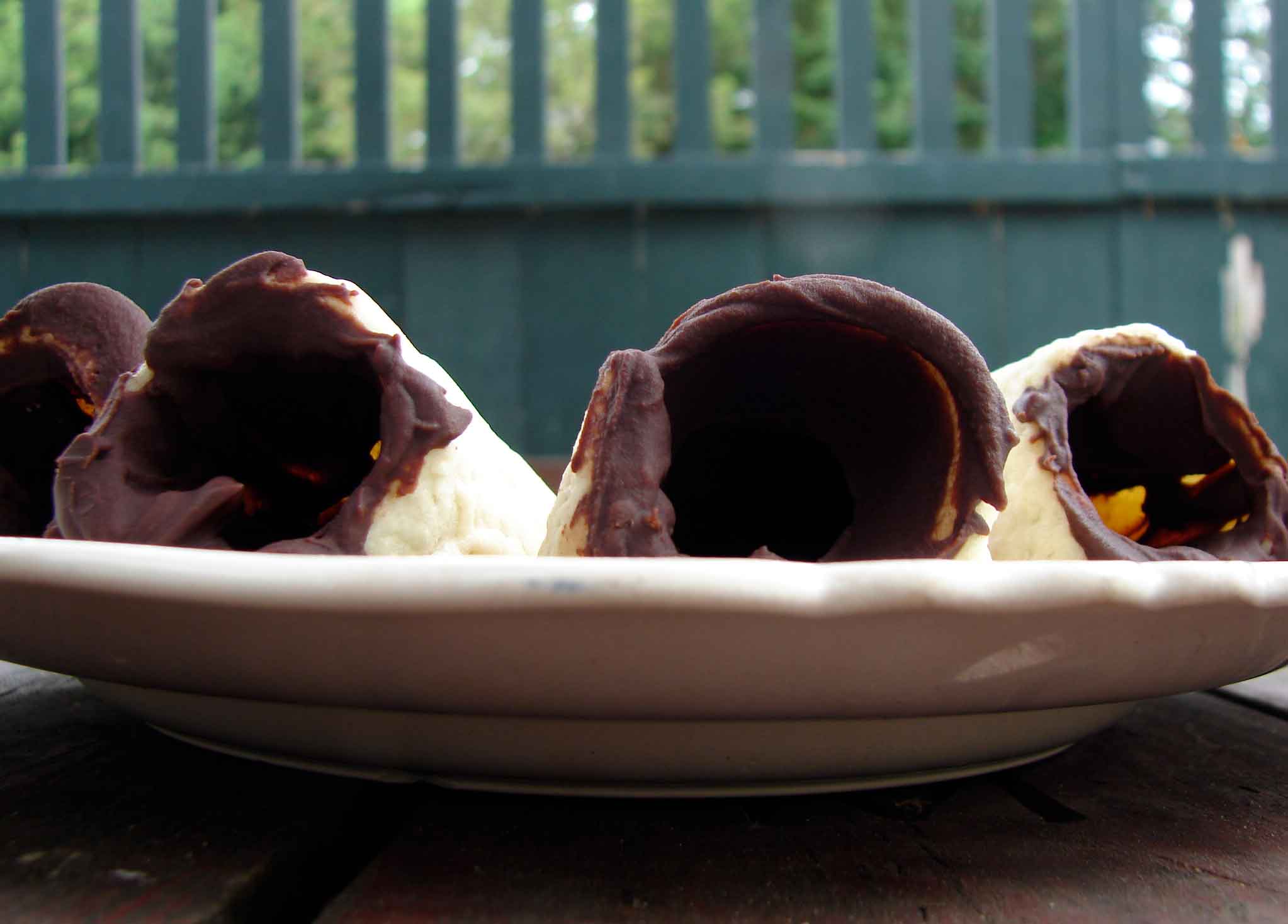 Chocolate-lined shortbread cones filled with almond pastry cream