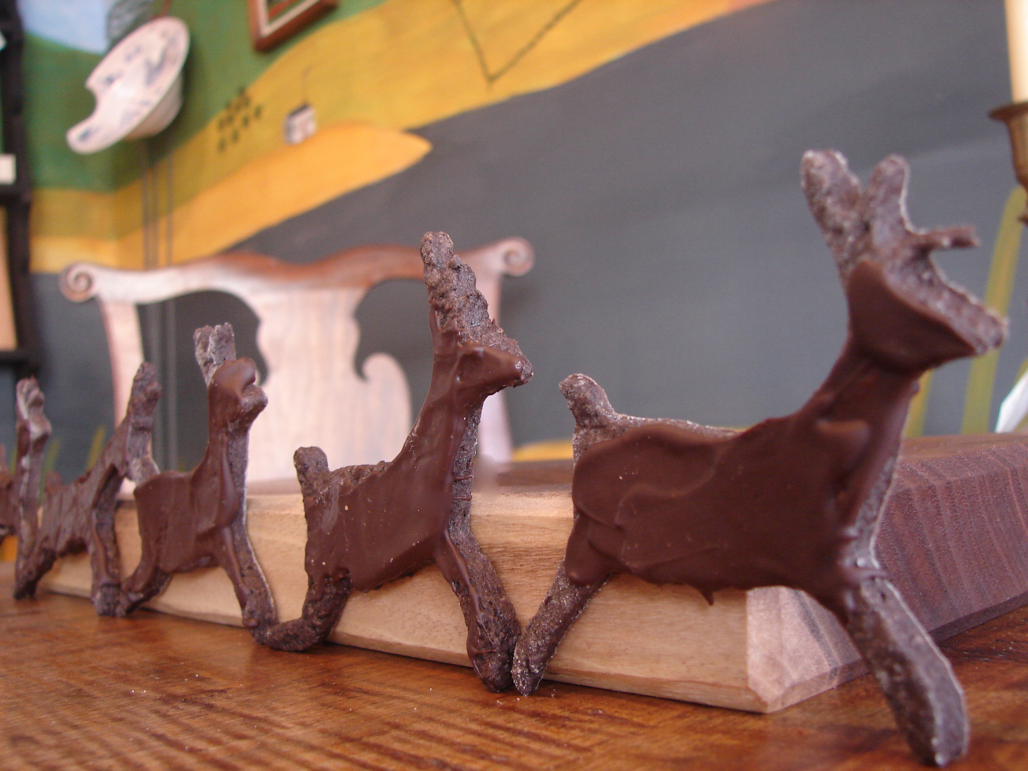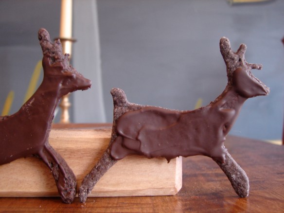 As I was making these, I said to myself, “Claire, you’re crazy!” Why? Because I made nearly the same cookie less than a week ago! And wrote about it here! Those were my spicy-hot dark chocolate cookies. As I mentioned at the time, they were like little cakes. Diabolical little cakes. Because they were a bit soft and had jam in the middle. I lay awake one night thinking these would also make good cookies to roll out and cut in cool shapes. And then coat with melted bittersweet chocolate. So I came up with this alternative recipe. The taste is very nearly the same – chocolate-y chocolate-i-ness with a spicy cayenne-ginger bite that sneaks up on you. But they’re a little harder and crunchier. And they hold the shape of your cookie cutters.