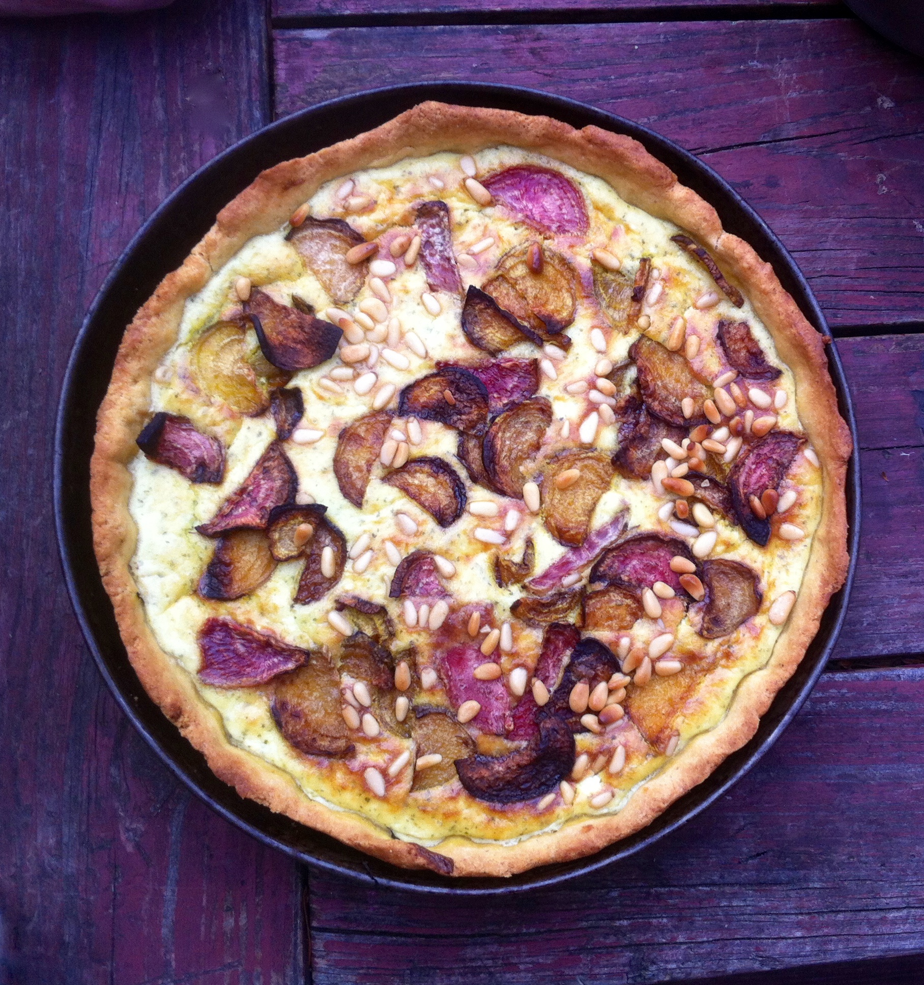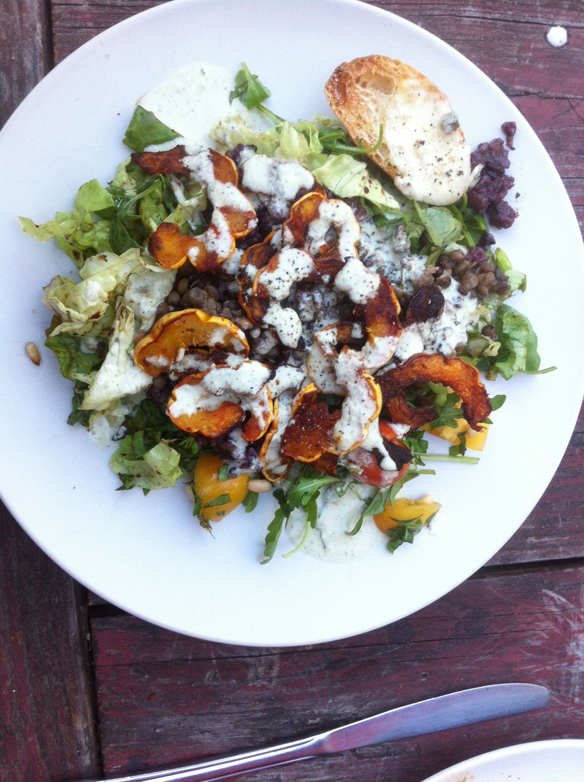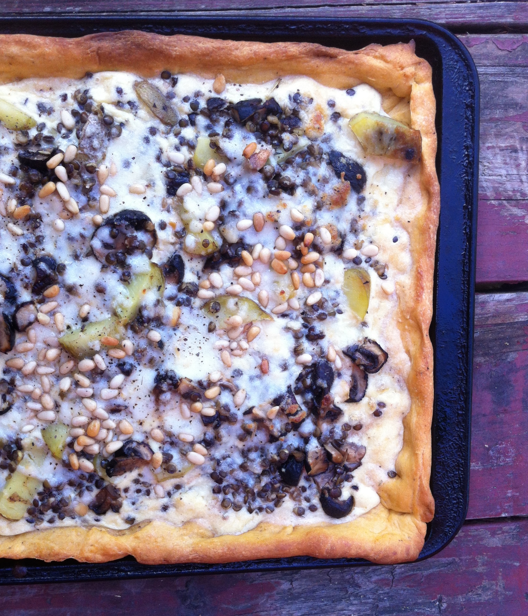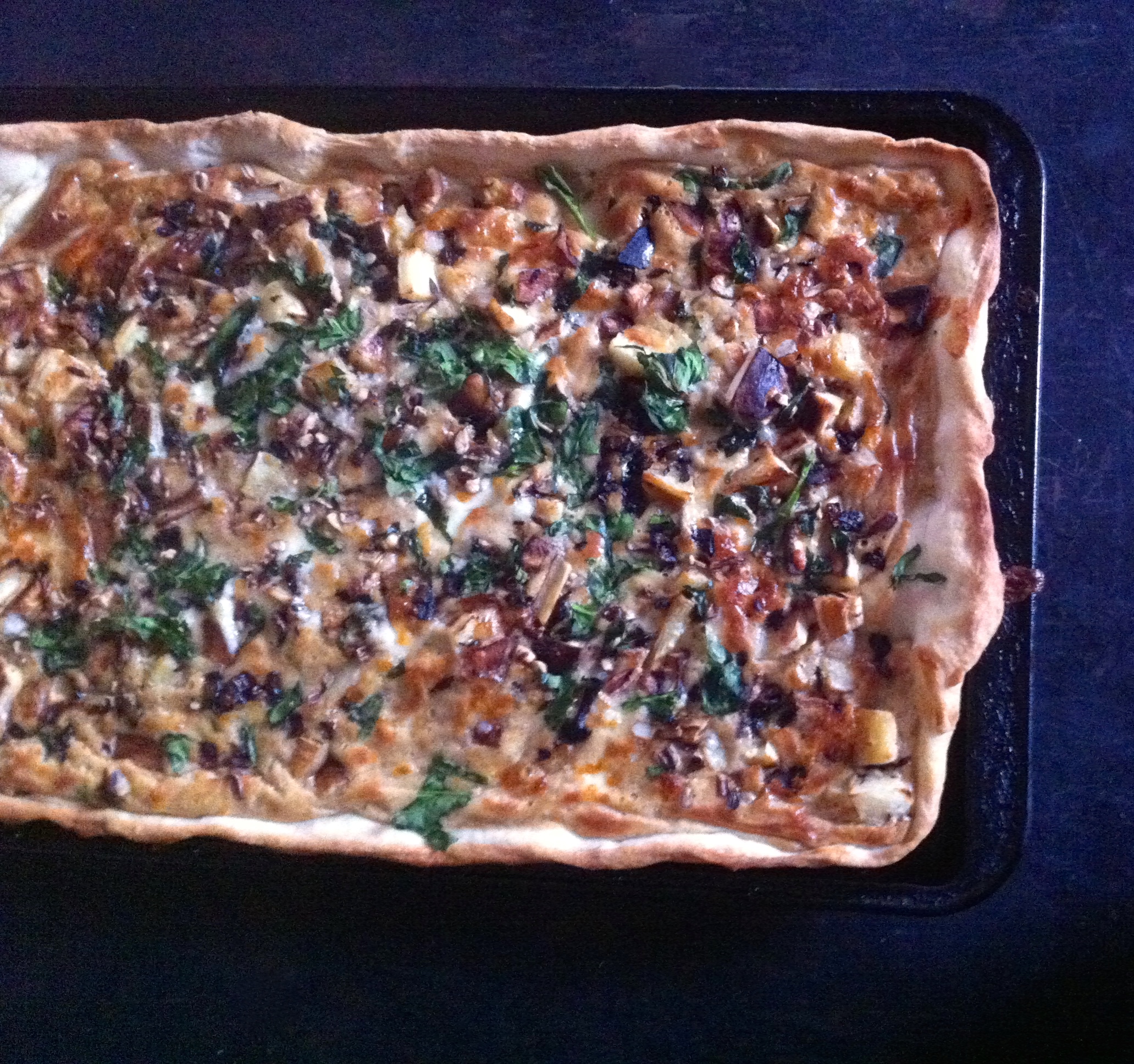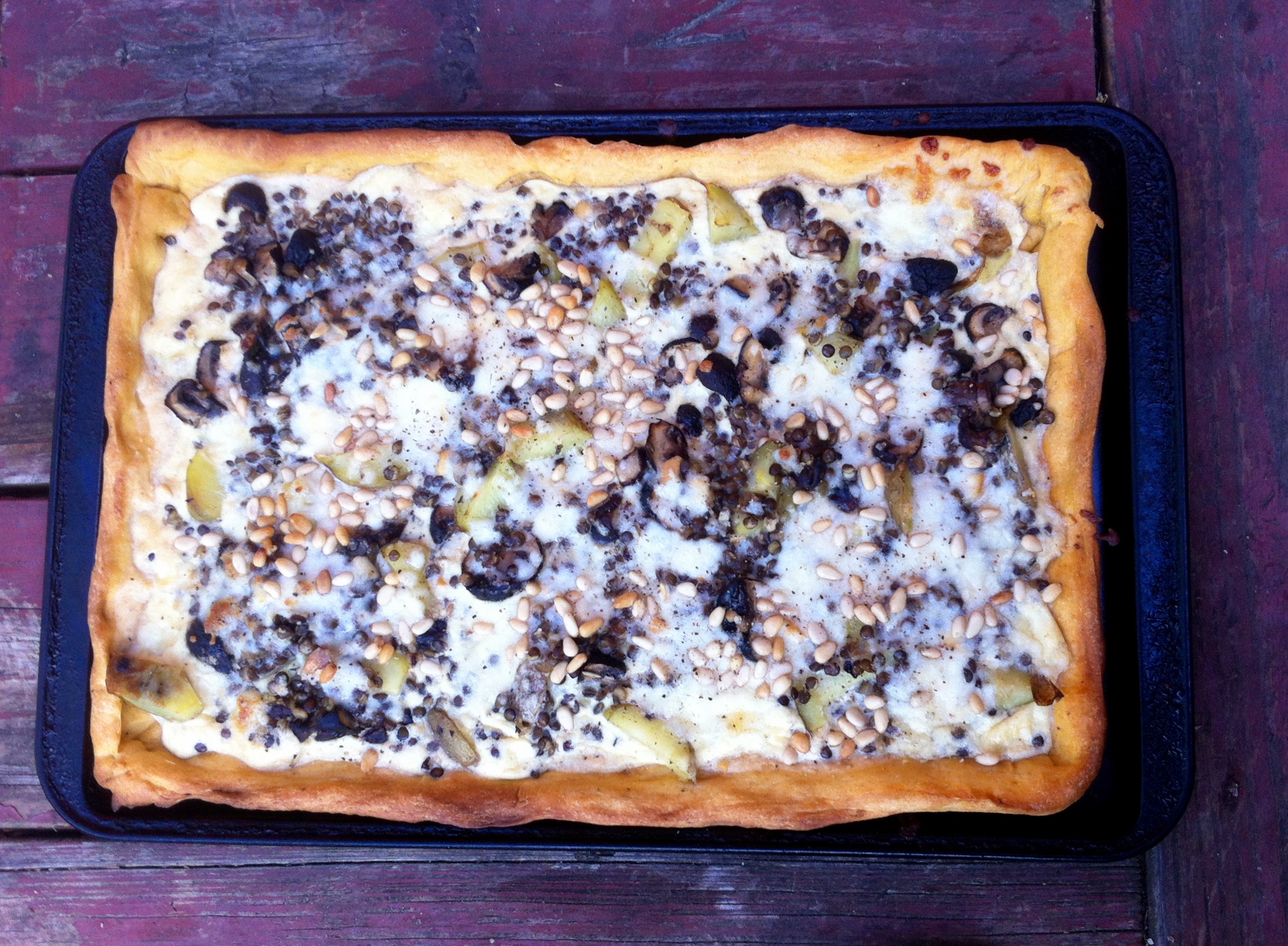 We have a forest of chervil growing in our garden. It’s the one herb that has thrived despite the few frosty nights, the drizzly days, and my constant picking. So I gathered some to make a pesto. Chervil is a lot more delicate than basil. It’s got a slight lemony-anise flavor, and it makes a lovely pesto. I made this like a normal basil pesto, with pine nuts and olive oil and garlic. Then I put it on a pizza with mashed potatoes for comfort and fresh tomatoes for liveliness. And that’s that.