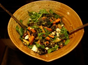 I love salad, it’s my favorite thing, and I want to eat it every night! But it can be so disappointing this time of year. Hard, flavorless tomatoes, pale icy lettuces. Bleh. So we’ve reinvented the salad to be a warm mix of lightly cooked vegetables mixed with olive oil, balsamic and herbs, and topped with crumbly, melty cheese. I decided to make a version of a Greek salad, because I had olives and feta, but you could do this with any mix of vegetables, herbs, and the cheese of your choice. It would be good with chard, fennel and goat cheese, or pears, walnuts and bleu. You could mix up the vinegars as well, if you’re feeling fancy. Or try nut oils. (I don’t have any, but I wish I did!) The trick is to cook the vegetables just as much as they need to be cooked…so they still have a bit of life and color and crunch. The cooking brings out the flavor of the winter tomatoes and the herbs. I used Kale, because it has such a nice texture and flavor once it’s cooked. Do the Kale a favor and cook it earlier in the day when nobody is around, then drain it and put it in the fridge till you’re ready to assemble everything. It tastes so much better than it smells when it’s cooking! And I added raw spinach right at the end, which wilts slightly as it meets the other warm vegetables, adding some brightness and crunch.