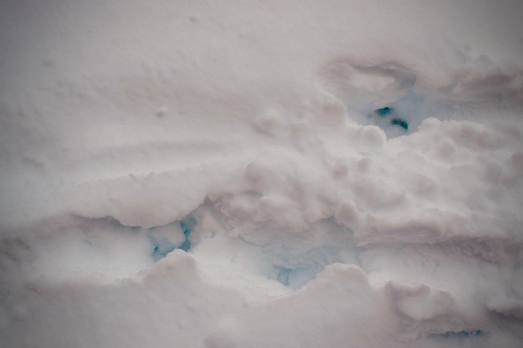 It had snowed all of the night and most of the day before. The snow lay in thick layers, mostly lovely and untouched. And the shadows were BLUE. Glowing, gorgeous, blue. I must have seen this before in my 51 years, but I feel like I didn’t really notice it until this morning. It’s such a ridiculously pretty color. Is there a light inside that giant snowdrift? Is it glowing from within? I could easily believe there is a glowing world under all this snow, and it’s shining through. And it’s the paw prints, the paw prints lead us into it! If there is a magical glowing world under the snow, of course it’s the dogs who will take us there.