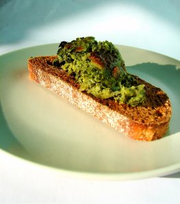 The sky is flat, dark, slate grey, gathering over the roofs and trees to the southwest. The sky is bright on the other side of the horizon, but the rooms of our house are becoming dusky-dark. The bright green leaves are showing their pale undersides, and a spattering rain is edging over the house. The wind smells remarkable – cool and green and sharp, after a day of damp and heavy air. A storm is coming! I’m a little phobic about storms. It’s tedious for my family. I won’t leave the house if a storm is predicted. Well – that’s not quite true any more, because they predict storms every day from May to September in this day and age, and I do leave the house in every once in a while during those months. The truth is, though, that I love a good storm, if all of my people are safe and sheltered. Storms seem to capture so many seasons and hours of the day in their cycle of anticipation and relief. The heavy stillness that precedes them, which you can feel weighing you down; the drama of the storm itself; the clearness of the world when it’s all over. And storms are creatures of the summertime, of course. Warm and ripe and bursting – like summer tomatoes. We don’t have any summer tomatoes, yet, but we do have lots of basil! And half a ciabatta baguette to use up! So I made these tomato basil toasts. This could probably be called bruscetta, actually. And it’s one of those things that’s so simple, you feel silly posting a recipe. But it’s perfectly delicious. I add capers and roasted garlic, to the trinity of tomatoes, basil, and mozzarella. The juice of the tomatoes mingles with a bit of olive oil and balsamic to create a lovely juicy sauce to dip your bread in. And that’s about it!