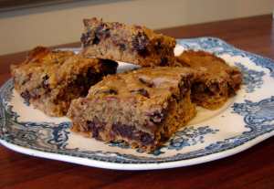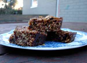 Malcolm likes fruity candy. Many days he asks for a dollar to go buy some fruity candy at the store down the block. But as nice as it seems for him to come home from a long day of school, when it’s cold and wet outside, and buy a box of candy, and cuddle on the couch with the puppy and watch a movie – nice as that seems, I can’t let him do it every day! So I bought him some dried tart cherries. They’re very nice! Chewy, fruity, lovely and sweet/tart. He ate half the bag, and then I put the rest in these bars, along with some apples and some chocolate chips. I added ground walnuts to the batter for a change of pace, and they made the bars lovely and dense, with a mysterious walnut flavor. I made these like brownies, which is a fairly lazy and easy way to make something. Melt some stuff in a pot, stir some other stuff in, and spread it in a pan. And that’s that!!