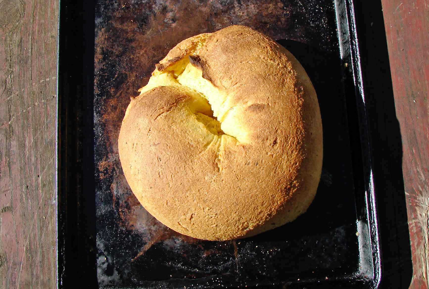 Sorry for this mad ramble! Let’s talk about the food! This is a yeasted corn bread. It has some corn meal and some regular flour. It has sage and cayenne, and it has smoked gouda and sharp cheddar baked right in. It’s quite soft on the inside, because I added some milk and an egg, but it’s nice and crispy on the outside. Perfect to cheer a gloomy, stormy day.