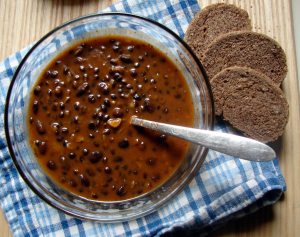 This is basically a two-can soup (can of beans/can of tomatoes), but it’s got a deep rich flavor, and a lovely, deeply richly colored broth (black bean soups can be so drab-looking sometimes, but this has a warm mahogany hue). Simply made, but complexly flavored.