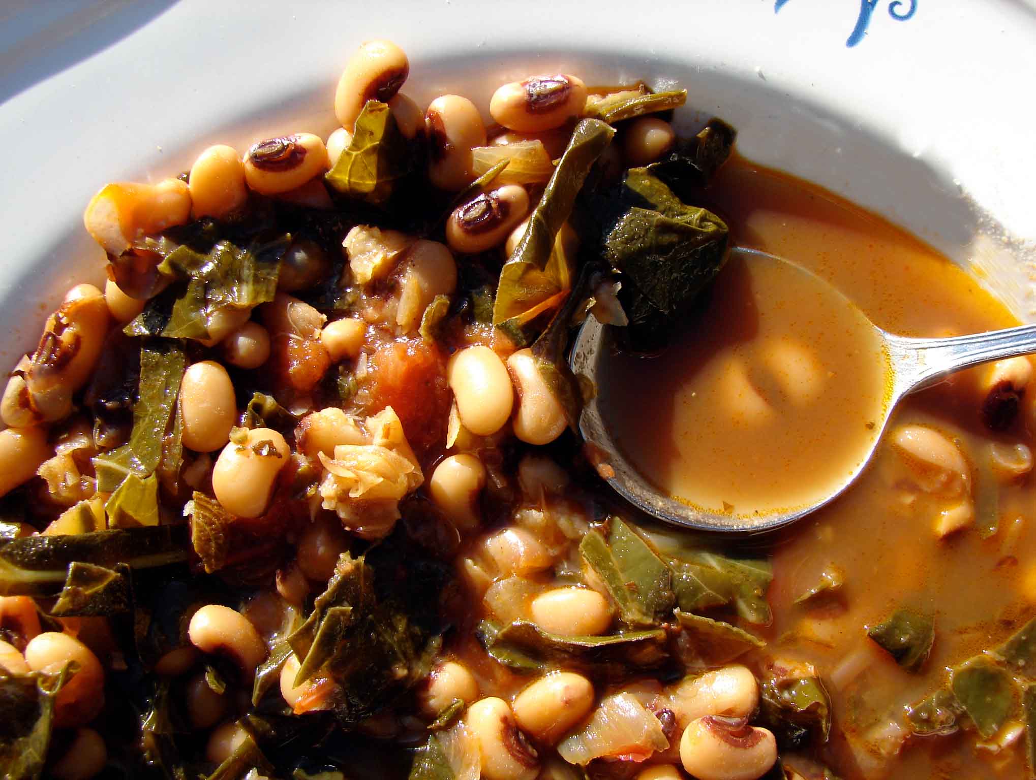 These smoky spicy sweet collards and black-eyed peas in a very brothy sauce went with the smoky cheesy bread I shared yesterday, much in the same way that this video goes with everything I wrote yesterday. They’re simultaneous. We ate them at the same time! I made the black-eyed peas from dried, which was fun. I cooked the peas and the collards at the same time, so that the cooking water becomes the broth for the dish. The smokiness comes from black cardamom, which is such an odd looking thing, with such a mysteriously delicious flavor. We also have pepper flakes and ginger for zing and pomegranate molasses for sweet tartness, Tamari for the umami, and a bit of brown sugar for molasses-y sweetness. A nice warm meal for a chilly rainy spring day!