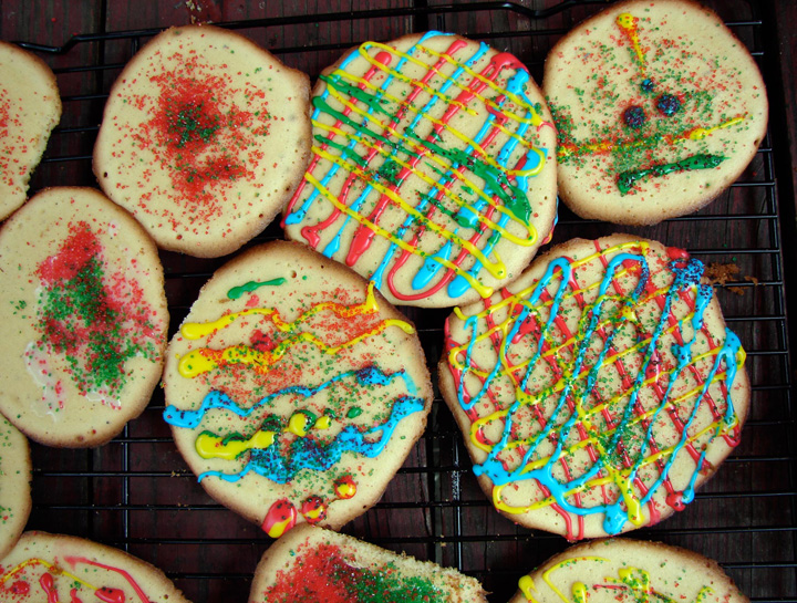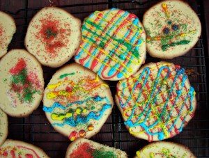 I like the way my French cookbook talks about cookies as if they’re cakes. I’m so confused by the recipes that I never know how they’ll turn out even as I’m making them, and it’s a joy to see them shape into this kind of cookie, or that kind of molded fruit and cream, or that kind of actual cake that I’d call a cake. My cookbook is very dry, each recipe is about 5 lines long, and they don’t take a lot of time to describe each step, let alone to editorialize about the recipe at all. And yet this particular recipe is full of charming asides. The cookies are to be cut in “bizarre and childish shapes.” It doesn’t go into further detail, so it’s really up to you!! And it finishes thus, “Et voila le gateau Alsacien, which one munches while watching the colorful candles on the Christmas tree.” Lovely! And I love the word schwowcbredel – talk about bizarre and childish!! We have some animal cookie cutters, so I decided to use an elephant, in honor of Babar, a lion, in honor of Duvoisin’s Happy Lion, and a balloon, in honor of The Red Balloon. The cookies contain marmalade, cinnamon, and orange flower water, which I’ve never cooked with before. It’s nice – floral but light and unexpected. I wasn’t sure the boys would like it, but they gobbled these down.