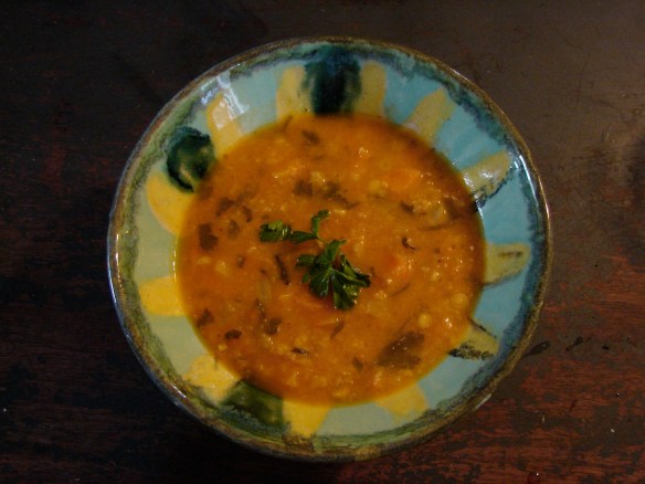 I have to admit to a fondness for split pea soup out of a can – that log of sludge, which slides out with a squishy sound. It actually makes a smooth and comforting soup. But the thing about split peas is that they don’t need to be thick and stodgy. They can be almost delicate, but still with that reassuring distinctive flavor. This soup combines yellow split peas with carrots (so many from the CSA!!) and a version of fines herbes. These herbs are FINE! Well, not quite. I used scallions instead of chives. And I used dried chervil because I couldn’t find fresh. It’s a light flavorful soup, with a nice amber broth.