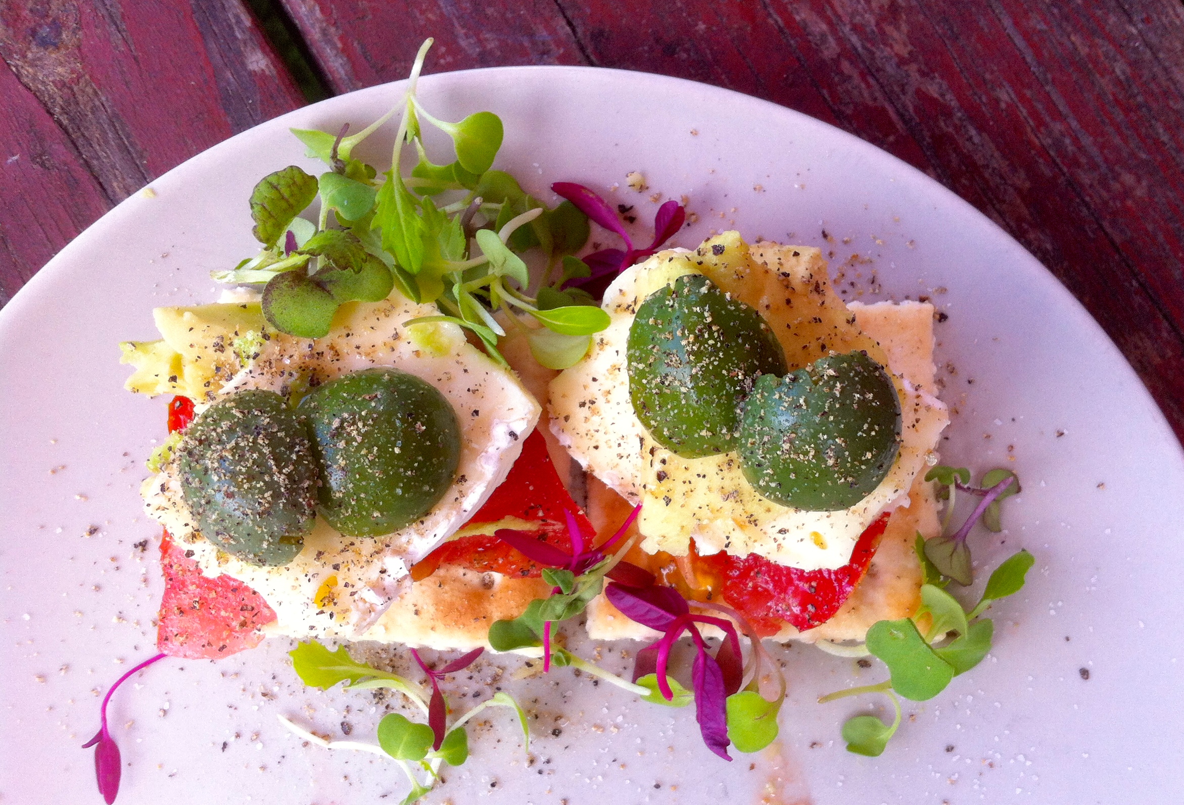 Second of all, let me tell you about my lunch. I’m very excited about it. It was: a saltine cracker topped with brie, avocado, tomato, castelvetrano olives and lots of black pepper. I don’t usually eat lunch, but I’d been thinking about brie and avocado for a while now, and I had to try it. Everything tastes good on a saltine cracker.