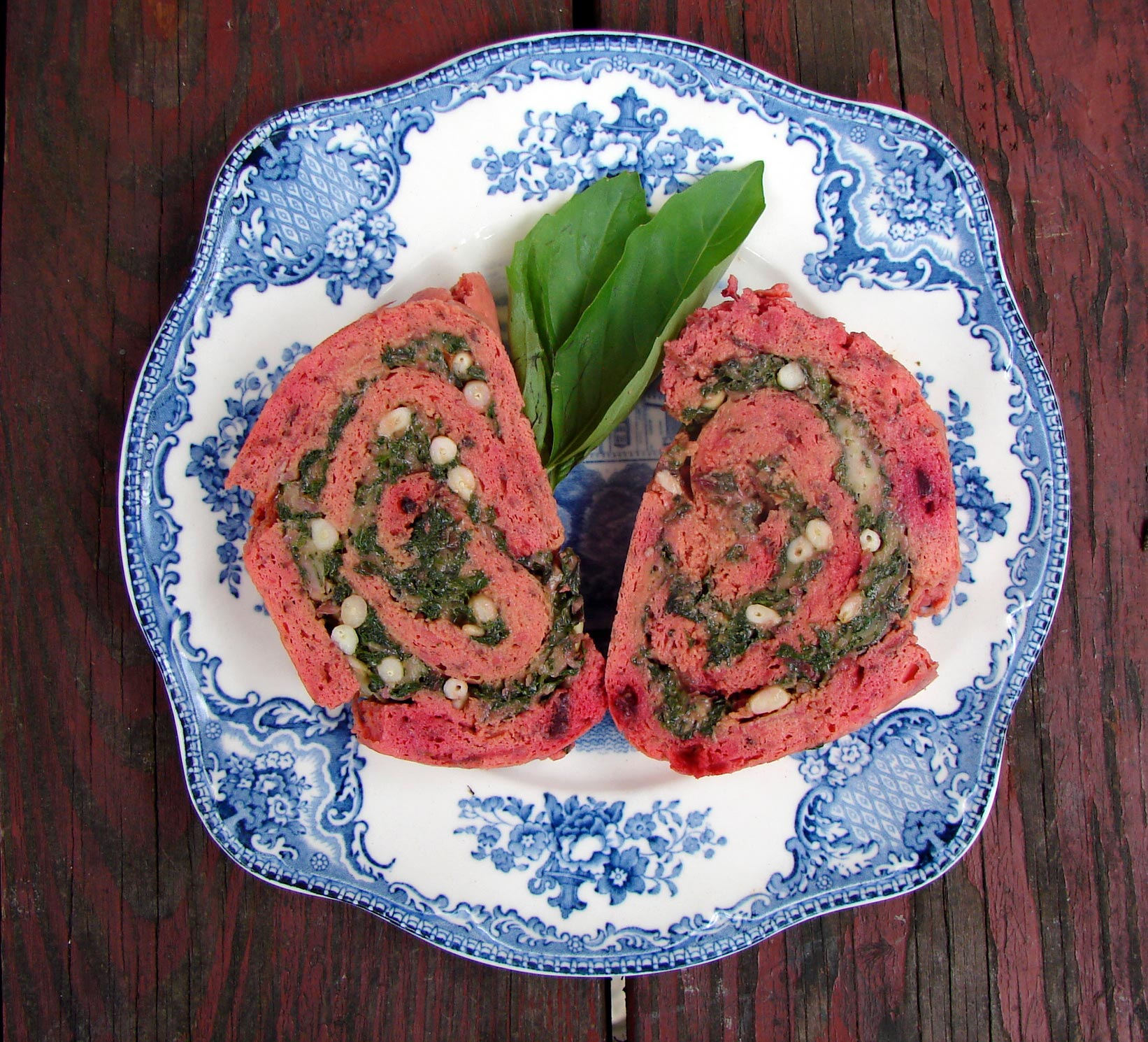 Beet & goat cheese roulade filled with greens and pinenuts