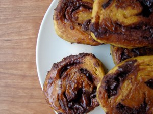 That, and, they’re spirals! With gooey cinnamon-y chocolate-y bits that you get to when you peel them apart. What could be more fun to eat than that? I should say, in the interest of full disclosure, I accidentally added too much pumpkin purée, which meant that I had to compensate by adding too much flour, which ultimately produced a very dense cookie. This recipe is adjusted to make a slightly lighter cookie, but it will still have that pumpkin pie-tenderness.Here’s The Great Pumpkin Waltz performed by the Vince Guaraldi trio.