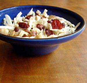 I’ll tell you about this simple coleslaw. This is a nice summer salad, because it’s supremely easy to prepare, and it’s light and clean, but quite substantial, too. It’s good to take to the shore, because cabbage, apples and carrots all travel well in a cooler. Apples and sharp cheddar are a classic combination, of course, and they’re nice here with the sweet bite of cabbage, and the nutty crunch of hazelnuts. I dressed this really simply, with olive oil, white wine vinegar, salt and lots of pepper. You could get fancier, with maybe a little dijon or honey or lemon, but I think the grated cheese added enough creaminess that a traditionally creamy dressing would have been too much too much. Isaac called this the “white salad,” and he liked it a lot. First he picked the hazelnuts out. Then, when everybody else had left the table and we were cleaning up, I glanced outside and saw him finishing it up. He cleaned his plate.