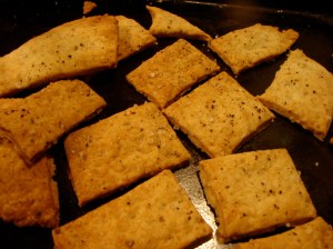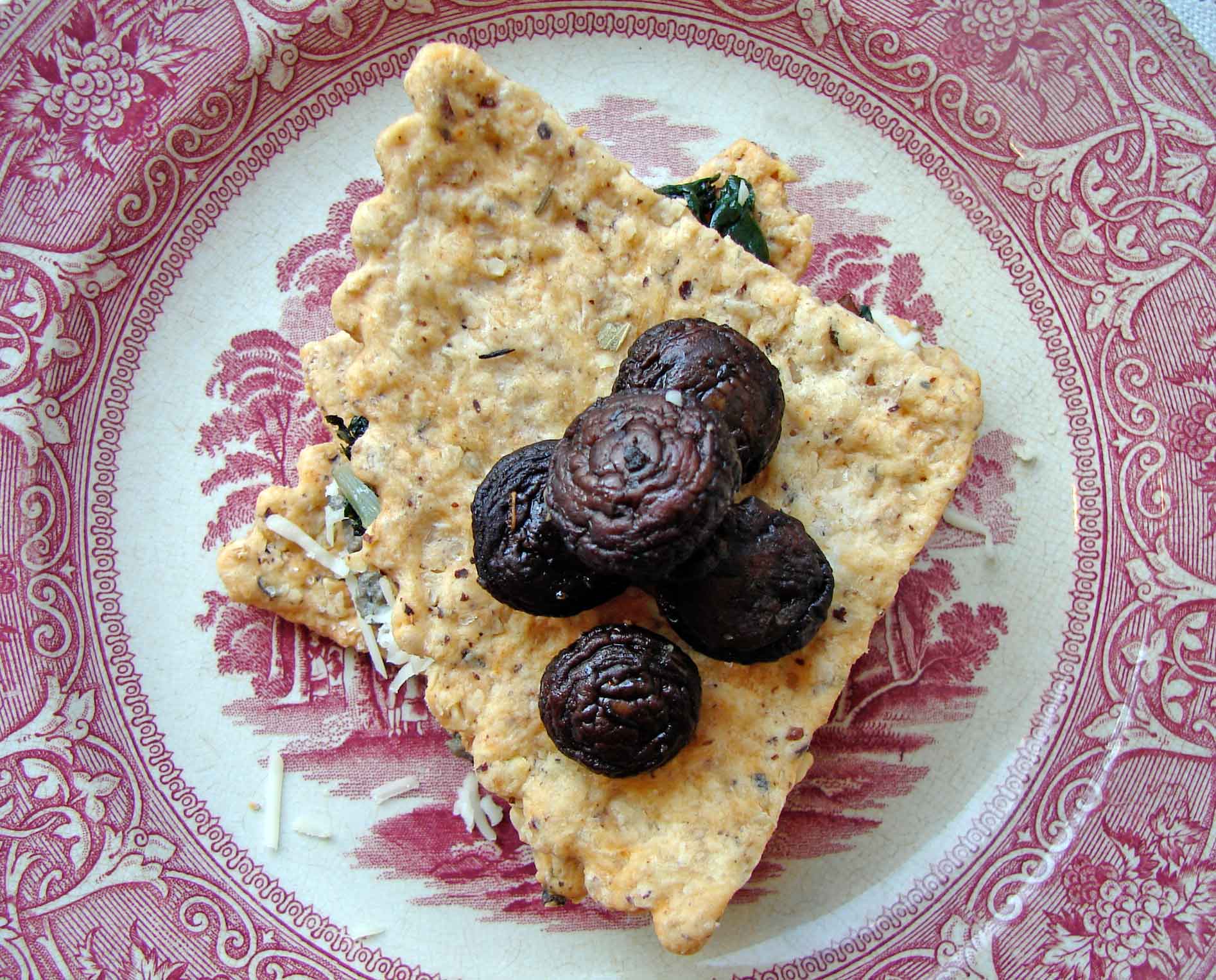 Last night, for valentine’s day, we took some time off. I made a special, strange meal. We ate together and talked together, and we let everything slide. We missed a basketball game and a meeting. We cuddled on the couch and watched a movie, and decided to skip the showers and the evening reading. It feels good to be irresponsible, some times! And, guess what? I’m a mother, so if I say it’s okay, it’s okay!! It was a really nice night. And the dinner was strange! I wanted to make something a little fancy, and less pedestrian than my usual fare. So I made some large fan-shaped crispy crackers, flavored with sage and smoked paprika, and crunchy with hazelnuts. I piled these with layers of sauteed chard, roasted mushroom & french lentil puree, cheese, and whole, small roasted mushrooms. It was very fun to make, and very fun to eat, too! I thought all of the flavors and textures were nice, altogether. I used my 8-ish inch tart pan ring to cut the dough into fluted circles, and then I cut those into quarters. You could use a medium-sized bowl with a thin edge. Or just cut it freehand with a knife. Or make circles instead of fans, by cutting with a large glass. Whatever, man!