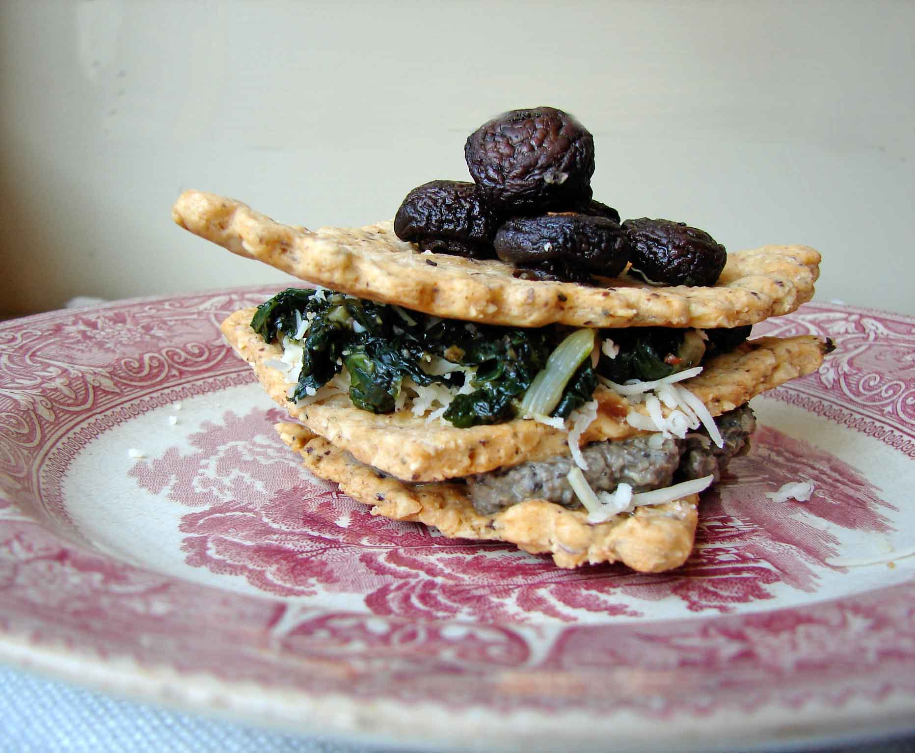 Hazelnut sage cracker fans stacked with roasted mushrooms, french lentils and chard