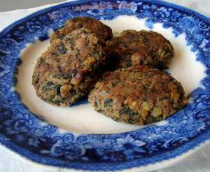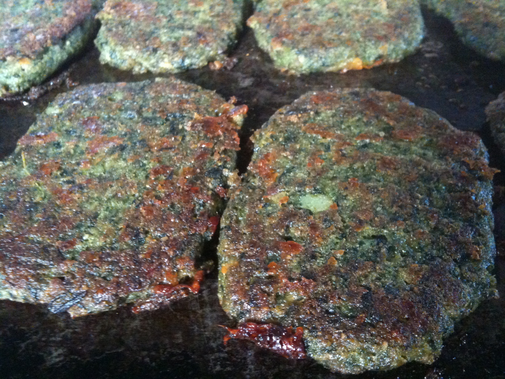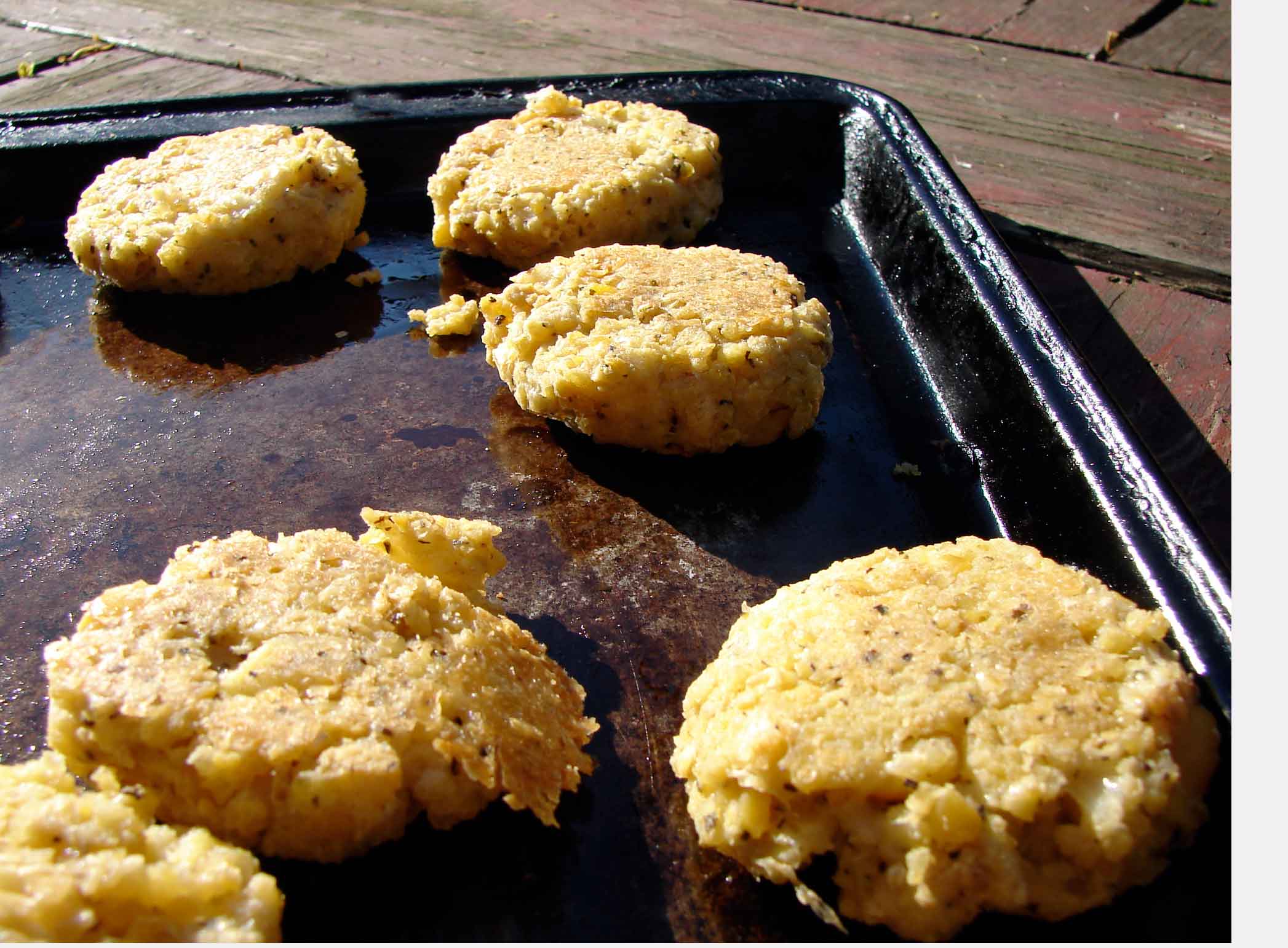 I wonder if I like cooking because it’s a chance to finish a project – to see it through to its tasty completion. When you start to make a meal, you can’t stop till it’s done. You can’t give up halfway through because you get to a tedious part. If things aren’t going well you have to fix them, you can’t just set it aside for another time and then forget about it completely. And you have the promise of a good meal that you can eat and share as motivation to get it all done. Plus it’s fun! These croquettes were so simple to make. I combined leftover millet with chickpeas and grated cheese. I seasoned them fairly simply, with basil, cumin and lots of pepper. They turned out lovely–crispy and delicate outside and soft and flavorful inside. We ate them with spicy spinach cashew sauce and OOTOs (yeasted semolina flatbreads), as well as avocado and arugula. But you could eat them with pita bread or tortillas, and any sauce you like…tahini or tomato sauce or mustard or mayonaisse, or no sauce at all. Very versatile.