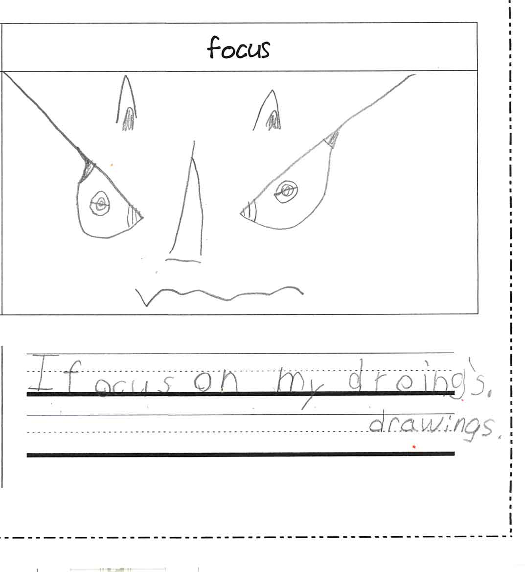 Malcolm’s basketball coach told him that if he keeps his head in the game he’ll be unstoppable. “Keep your head in the game” is now my favorite phrase in conversations with myself. “Keep your head in the game, Claire, or you’ll never get two breakfasts and two lunches made by 7:30!” And Malcolm’s teacher said that with a little more focus he’ll be unstoppable. There it is, the “f” word. It all comes down to focus, it all converges at focus. Isaac has been advised that he needs to focus on his focus, as well. It’s a distracting world! There’s so much going on, so much to see and say and taste! How can anybody concentrate on just one thing? It’s all very well to tell somebody to keep their head in the game, but the game is so complicated! The game is so fast-moving and there are so many things going on at once! One is in danger of getting one’s head bonked, if one keeps it in the game for too long! I’ve always had trouble focussing, too, so that’s probably where the boys get it. I can’t concentrate on one thing very long, with my gnat-like span of attention. My life is strewn with half-read books, half-written novels, half-sung songs, and lots and lots of brilliant ideas that never amounted to much (you’ll have to take my word for it). It doesn’t feel good, and I would wish my boys more success in concentrating on one task until it’s completed. I wish for them the ability not just to focus narrowly on one thing, but to bring everything around them into focus. To adjust the lens through which they view the world so that everything is as bright and vivid and clear as they can make it. Malcolm has discovered the joy of focussing beams of light through a magnifying glass until he makes fire, and this is sort of how I can see him moving through life–focussing his light and energy to set the world on fire. (Safely, of course, as executed with focus’ good friend self-control!) And I hope they’ll be able to concentrate on everything that interests them in the sense that they’ll distill it and make it as pure and flavorful as possible, creatively speaking. Isaac is a rare child who can actually sit and concentrate on one project for a fair amount of time. He’s happy with his own company, singing and drawing or making something out of legos. From when he was very little, his whole face reflects his absorbtion–head on one side, tongue out like Charlie Brown. Here’s Isaac’s picture of a focussed face…
