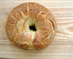 And as you know, if you’ve been paying attention, I’m very fond of the idea of making a wild mix of herbs and greens that I combine in a sort of patchwork quilt of surprising flavors in tarts, or soups, or potatoes. Well, yesterday I made a special meal for our anniversary, and I made this bread. I shaped it in a ring to symbolize our marriage (but you could make any shape you like). As I think about it, herbed bread is a nice metaphor for marriage – sustaining, comforting, but full of flavor and surprises. As I ate it I thought the flavors were wonderful, all together, but it’s hard to pick out any one thing that makes it so. The work of growing the herbs, and kneading and shaping the bread is wonderful, fun, fulfilling work, just like a marriage.