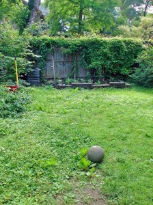 This is a lovely time of year at The Ordinary Estate. Each evening after dinner we walk through the balmy flower-scented air, sipping glasses of fine wine. We wend our way down tree-lined lanes, to inspect our fields and vineyards. Ha ha! Our yard isn’t big enough for one tree, let alone an entire boulevard of trees! And we’d be drinking two-buck chuck! And our boys would have dug some kind of small pit in the yard that we would trip in and twist our ankles! We live in an 1850s industrial-style house, attached on one side. Our whole town is like this, and we all have small, connected gardens. Here’s ours…