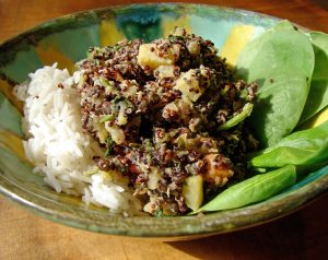 But let’s get back to the food, man. I remember when it was all about the food. I went to Whole Foods a few weeks back, and I stocked up on black grains. Black barley, black rice, black quinoa… (What, quinoa is not actually a grain, it’s a “pseudocereal”? Good god.) I like black grains and grain-like products because they’re very pretty, and because they usually have a nuttier, meatier taste than their paler cousins. Black quinoa is no exception. It stays a little crunchy, it turns a lovely garnet color, and the little pale squiggly spiral comes out to tell you that it’s done. I thought the quinoa would taste nice (and look good!) with beluga lentils. I wanted to try something a little different with the seasoning, because I feared I was getting stuck in a rut. So I opted for tarragon, fennel seed and ground coriander in a sauce made from white wine and orange juice. Fruity, citrus-tart/sweet, and anise-y! I thought it was nice! I thought it would go well with sweet potatoes and carrots, so I added some of those, too. And I threw in handfuls of baby spinach at the end, because everything is better with baby spinach! We ate it with basmati rice and a salad of arugula and more baby spinach. The rice is probably overkill with the quinoa, but it was one thing I was sure the boys would eat. I grated some sharp cheddar on mine, and I thought it was a nice addition.