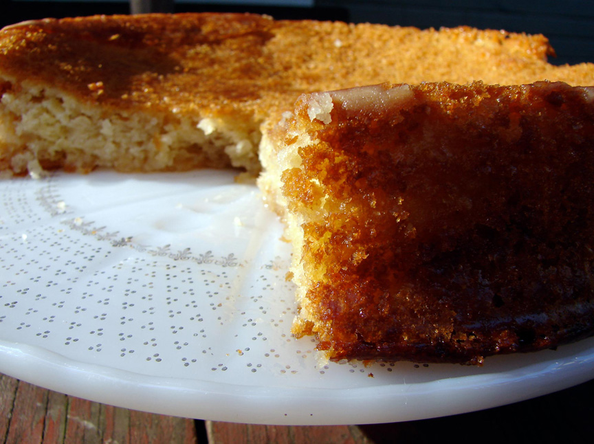 And this cake is a subtle shift from the last that I wrote about, which was a quatre-quarts, or pound cake. This one is very similar, but it has ground almonds, which add their lovely and distinctive taste and texture. The cake is still very simple, and would make a nice base for a more complicated dessert – for trifle, or cream and fresh fruit, or a soaking of rum. I made this cake the day of the storm, and I ate it for breakfast when the power was out the next day. You can see all the leaves Sandy left on our picnic table!