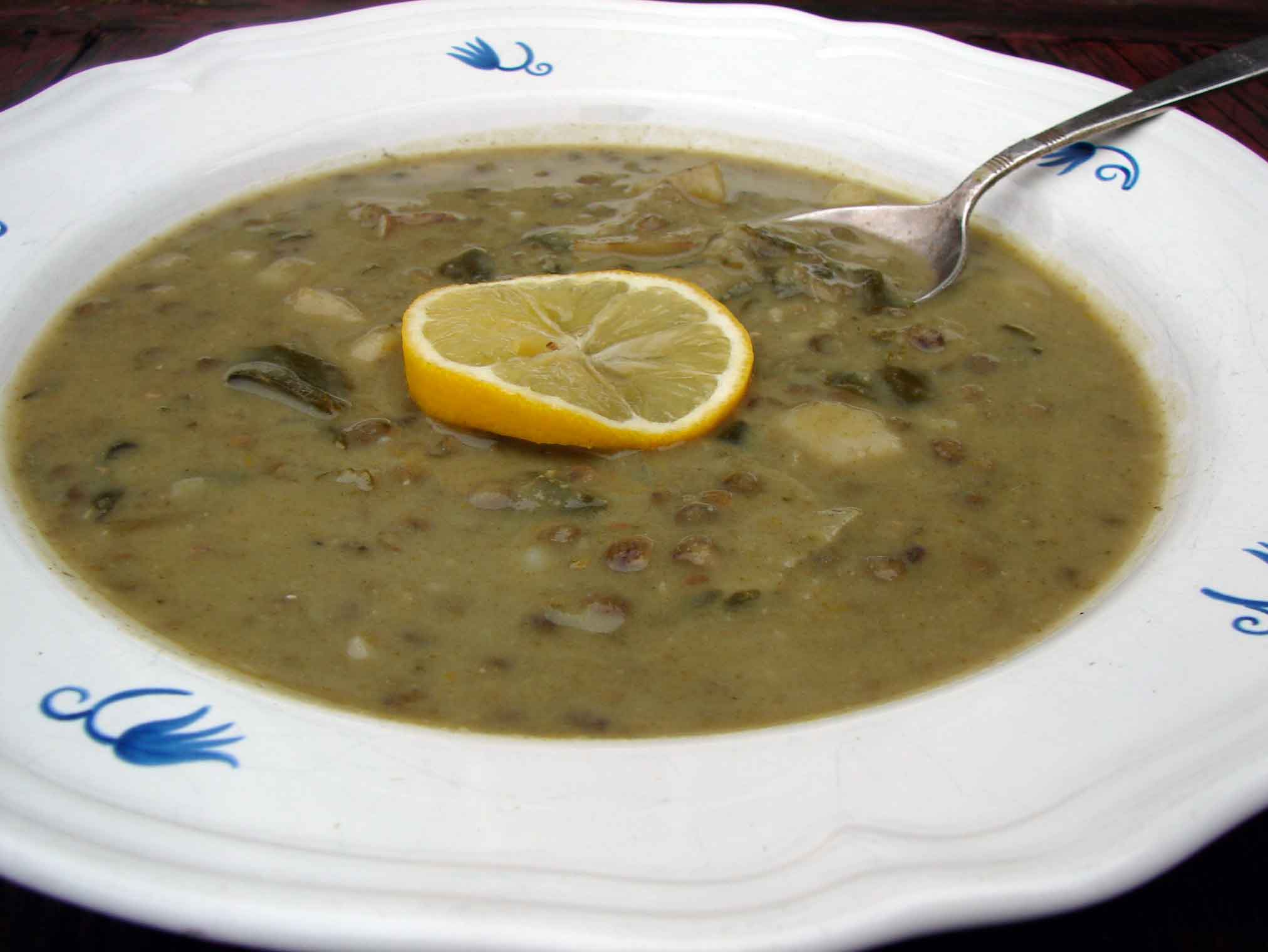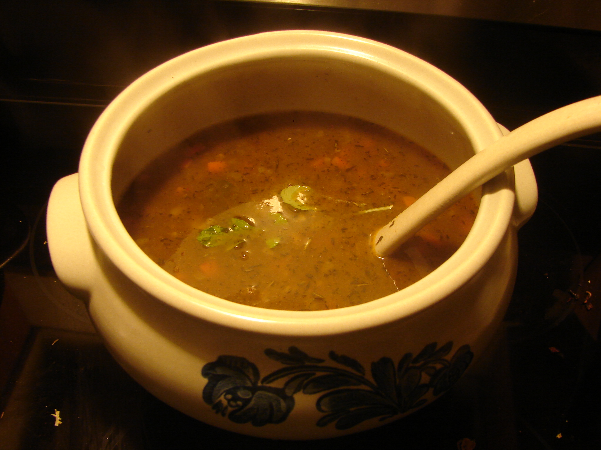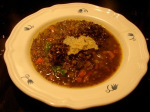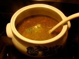 Well, I’ve mentioned that we’re all feeling a bit under the weather, here at The Ordinary. So I wanted to make a rich, comforting soup that would have a bit of spiciness to cut through the lurgy. So I made this soup, with french lentils and farro, for sustenance, spinach for all-around wonderfulness, and cayenne, ginger, and lemon, for salubriousness. It was very good! We floated green toast in it, made from the colcannon bread, which was lovely. This is a very hearty, meal-in-itself soup, but it wasn’t heavy at all – it had a nice warm smoky broth, and the ginger and lemon helped to brighten it.