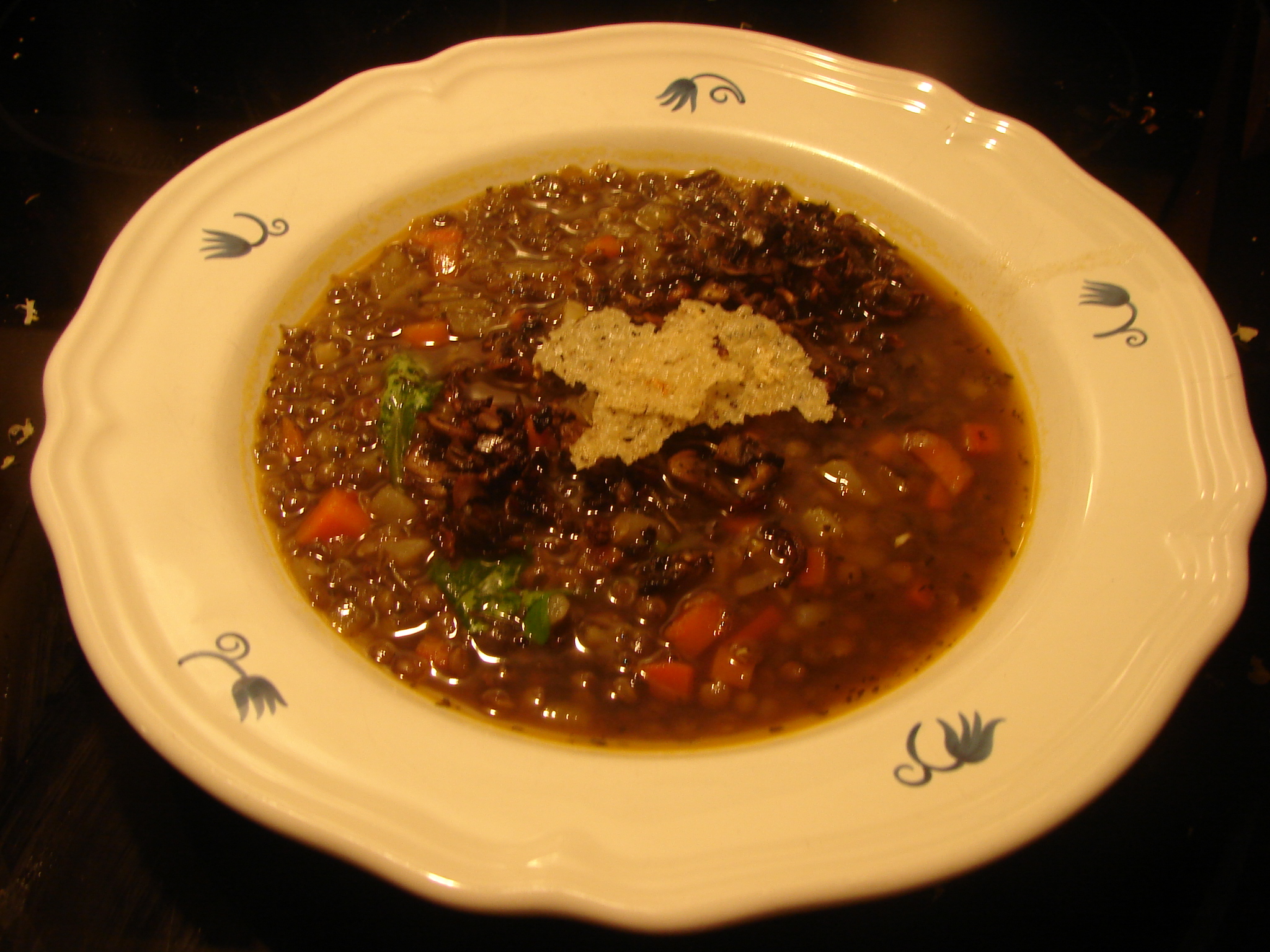 Beautiful, tasty french lentils don’t get mushy. If you cook them properly they retain a little crunch, so this isn’t the porridge-y lentil soup that you might expect. The lentils, carrots and potatoes float in a delicious, herb-infused broth. And I love mushrooms, especially in combination with french lentils, but I don’t love the way they get a bit slimy in soup – I like them crispy and flavorful. So I decided to roast them with shallots until they’re very crispy, and use them as a garnish. And to top it all off, I made little lacy crisps of sharp cheddar, which melt into your soup. Eat it with a good loaf of ciabatta and you’re all set!