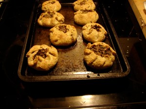 Anyway. We had some food in our store, for anybody that was brave enough to come in off the street. I made three kinds of savory pastries. And I’m going to tell you about all of them!! One at a time!! They all turned out really good!! Or so I think!! The nice thing about savory pastries (I’ve said it before and I’ll say it again) is that although they’re probably best hot out of the oven, they’re also very tasty at room temperature. So they’re nice for parties, or picnics, or art openings, or to offer at street festivals. They’re easy to pick up and carry around, and they combine lots of good flavors in a manageable package.