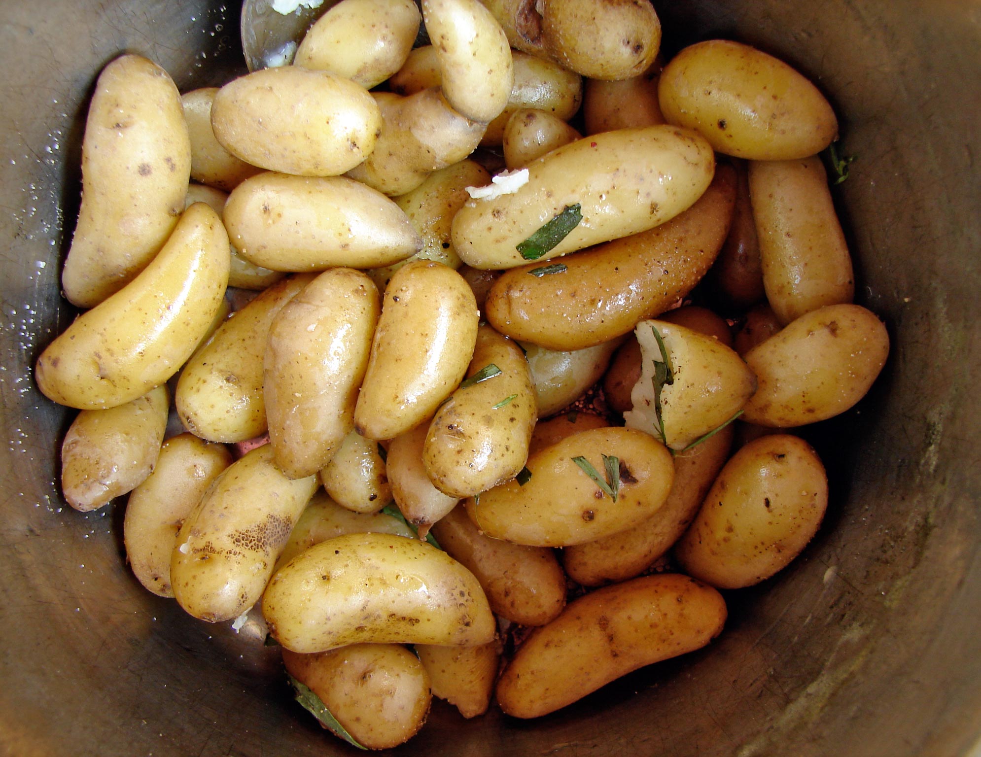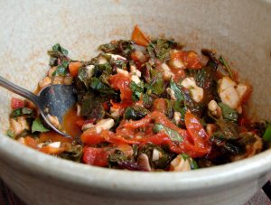There’s something very summery about the photos, maybe because, like summer, they seem to last forever and they’re over in an instant. If a recipe can capture a moment of summer, and I like to think that it can, surely it would have tiny potatoes and tomatoes and basil! And here we have two very easy, very summery side dishes. One is straight out of the CSA box – beet greens, chard, green garlic, tomatoes, and tiny potatoes. Is there anything more pleasing than small potatoes, boiled whole, and tossed with butter and herbs, and seasoned with salt and plenty of pepper? We used tarragon, because it’s nice with potatoes and we have it growing in our garden. But you could use any mix of herbs you like. This is a good way to use up the beet greens when you make beet dogs. I used a mix of beet greens and chard (very pretty, both!) and made a quick summery sauce of fresh tomatoes, basil, and garlic. While it’s hot you toss it with boiled potatoes, little cubes of mozzarella and pine nuts. The heat from the greens melts the cheese, and it’s all very nice. The other dish is my version of the Spanish tapas dish patatas bravas, which is crispy potatoes over a spicy tomato sauce, topped with garlicky aioli. Ever since I made almond aioli, I’ve wanted to try it with this, and it turned out really good! I made a slow-cooked tomato sofrito as the base, and you can use fresh or canned tomatoes for this.