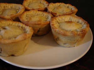 I’m fascinated by hot water crust pastry! (Also called raised pastry.) I’d thought of pastry as a chilly, hands-off affair, with everything ice cold, touched only by fingertips, and laid out on a cold marble slab. Well, hot water crust pastry is made with boiling water and melted fat, you get your hands right in there and knead it, and then you mold it as if it was play-doh! It really can put some childish fun in making pies. It’s also a bit of a challenge, and it took me a while to find the right proportions. The idea behind this dough is that it makes a pastry so strong that you can pour gravy inside and it won’t leak out. So strong that you can put it in your pocket, and it won’t crumble. So strong that Rogue Riderhood can make it into plates…