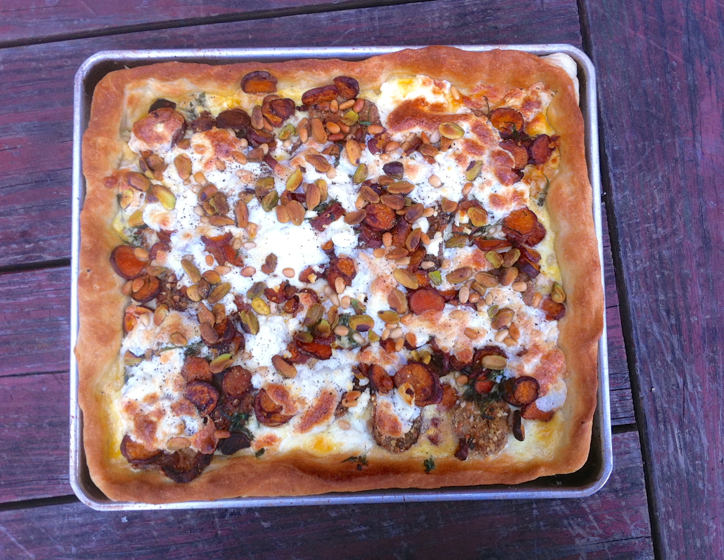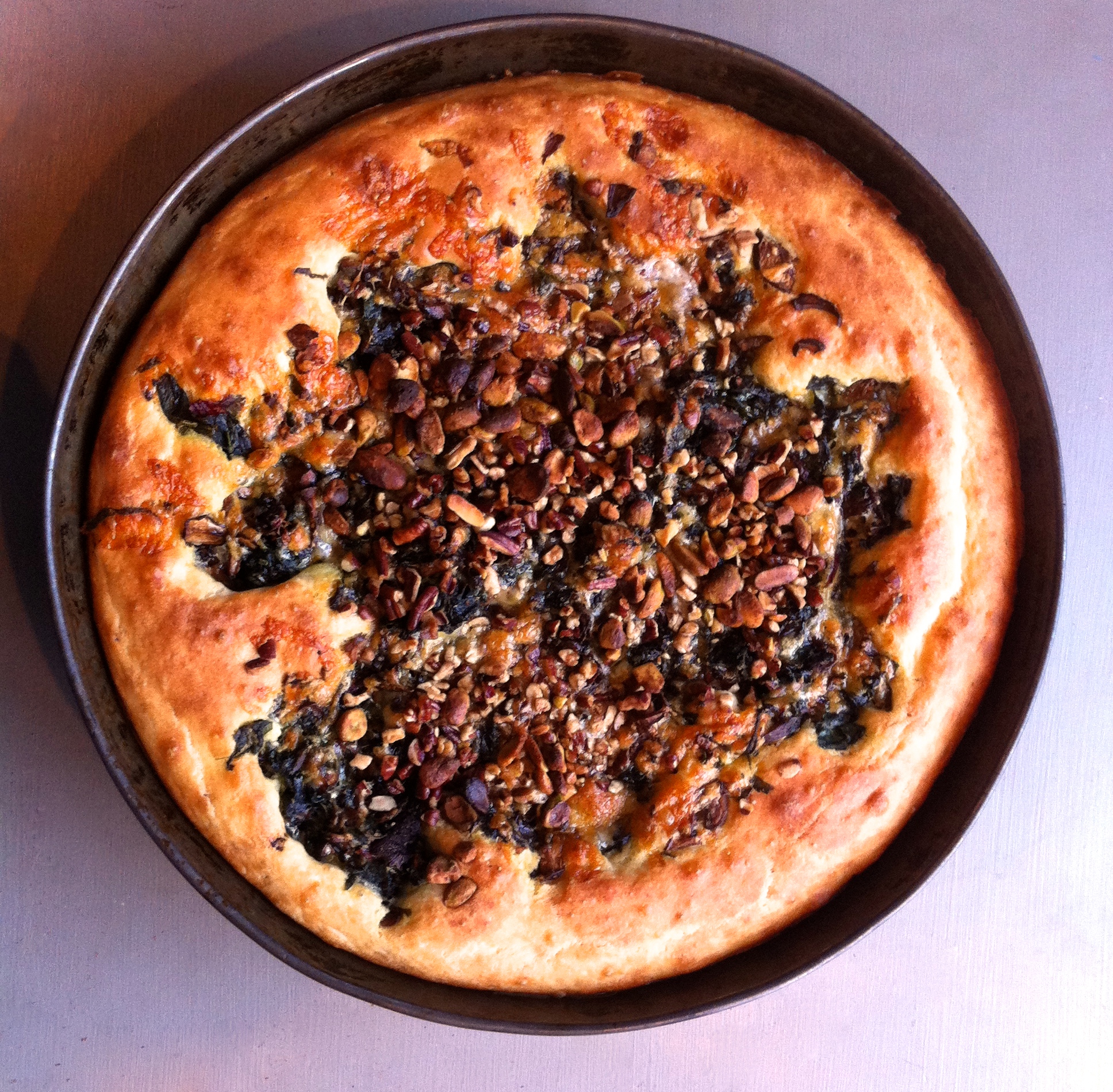 I’ll blame it on the weather, on the seemingly endless winter, but I’ve wanted to make warm comforting bready meals lately. Last night it was this savory cake, which is a lot like a pizza with the toppings baked right into the dough. I made the dough rich and tender, with butter, milk and an egg (I think of it as brioche-like). And I filled that with my favorite combination of chard and mushrooms. I used pecans and pistachios, but you could use one or the other, whichever you have. We ate this with leftover asparagus pesto and with a pecan sauce something like this one.Here’s Rag and Bone by The White Stripes