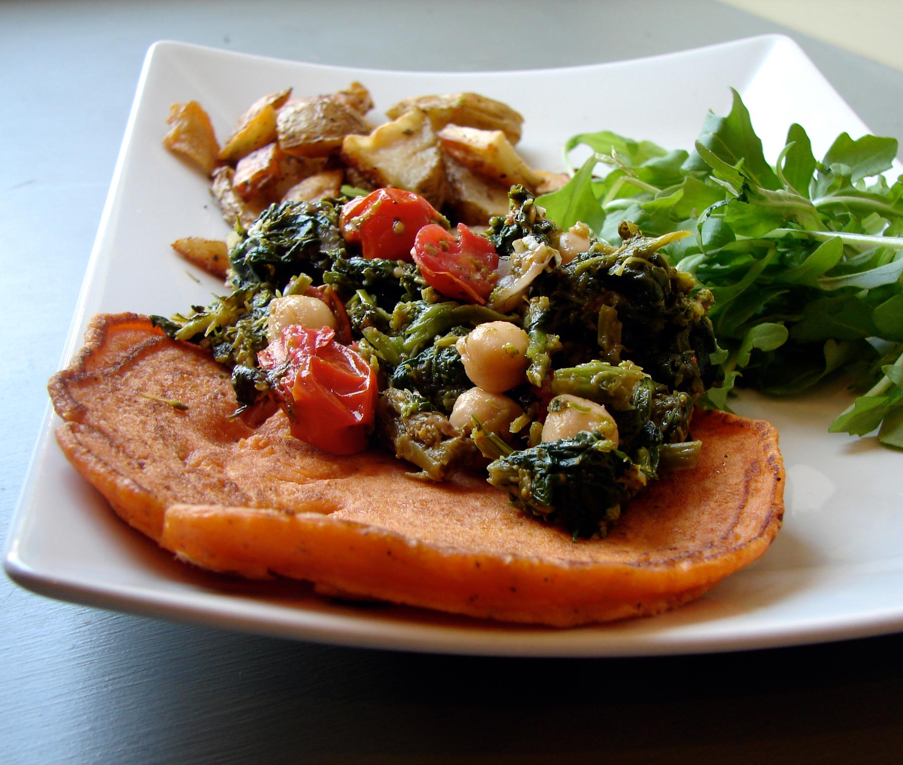red pepper semolina crepes with broccoli rabe & chickpeas