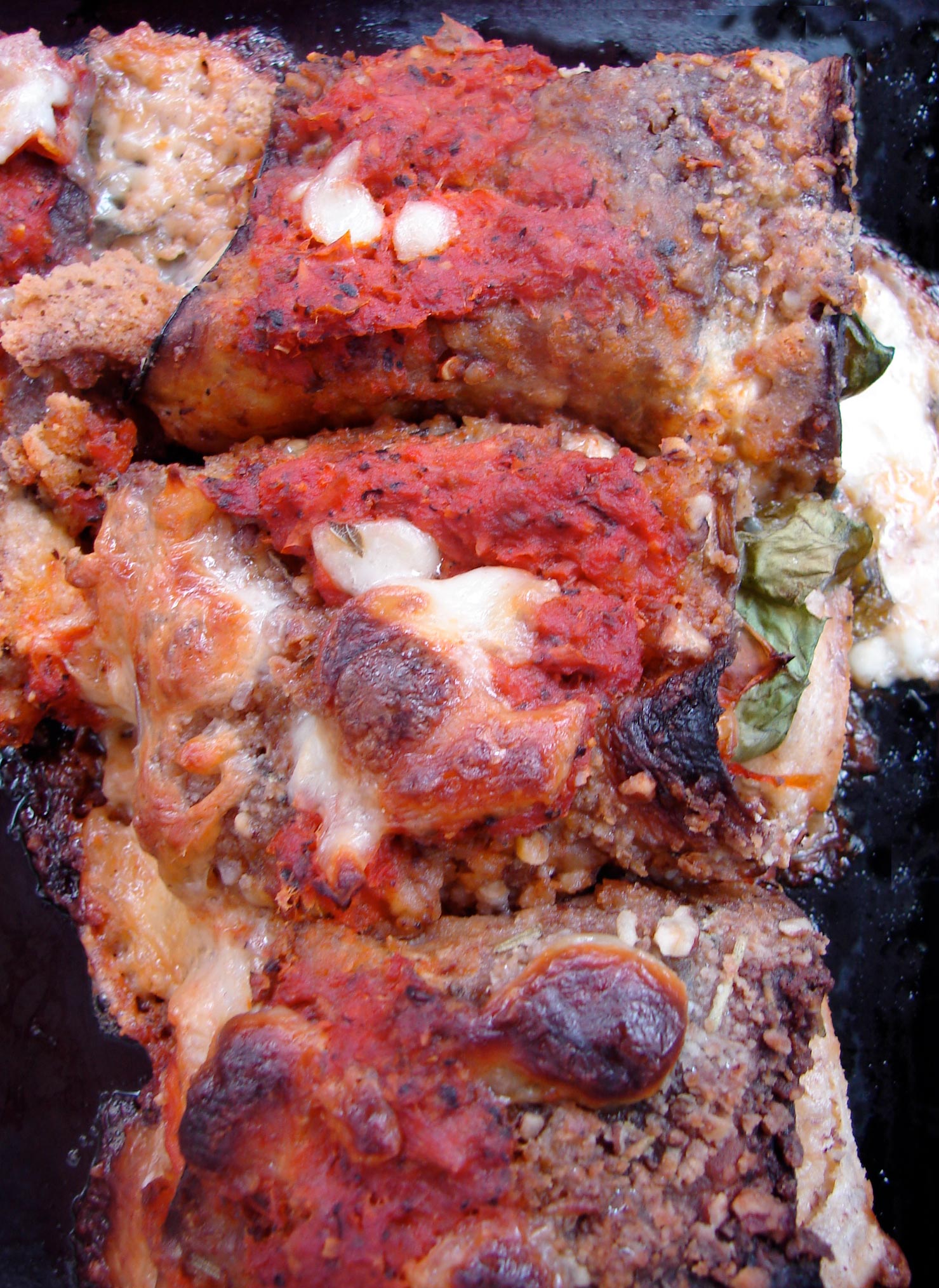 Which is what happened when I made this eggplant rollatini. It’s a simple dish. Long strips of eggplant, marinated, breaded and roasted, lined with slices of roasted red pepper, thin pieces of mozzarella, and an almond “ricotta.” I thought the almond ricotta turned out very good. Obviously, the meal isn’t vegan, because it contains an egg and mozzarella, but if you left those out, it would still taste good. The almonds added a lovely, deep, sweetish flavor to the very savory and tangy tastes of eggplant and tomato sauce.