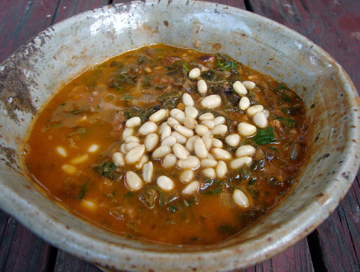 Chickpea stew with tomatoes, chard and castelvetrano olives