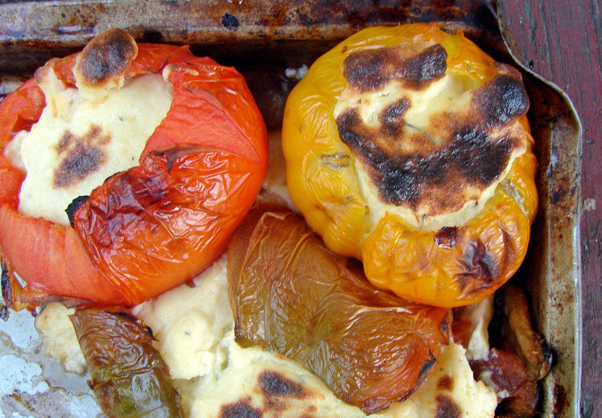 The semolina has a lovely, soft texture that absorbs the tomato-y juices. Then I thought about giant slices of tomatoes that feel like steaks, and I decided to coat them in pepper, fry them in a little butter, and then use the juices to make a sauce, with shallots, garlic, and wine. It made a nice side dish, and I think it would be nice over angel hair pasta. Finally, we had an heirloom tomato the size of a small pumpkin. I decided to open it in thick slices, and stuff a flavorful salad into the spaces – roasted red peppers, fresh mozzarella, capers, olives, and fresh basil. Fresh and delicious!