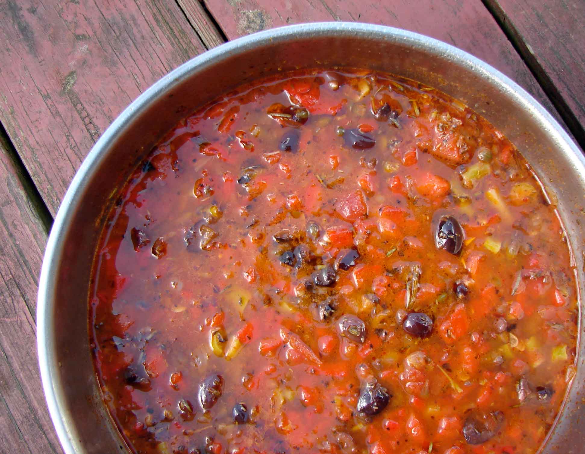 Both of my boys actually liked this meal! I made long tube-shaped pasta called perciatelli. Like spaghetti, but with a hole in it. I wanted to make a brothy sauce to go with it, so I made this concoction of asparagus, roasted red peppers, olives and capers. It’s got white wine and lots of herbs, and a little bit of tomatoes. The boys used the pasta like a straw to suck up the broth, but they ate all the vegetables as well, miracle of miracles.