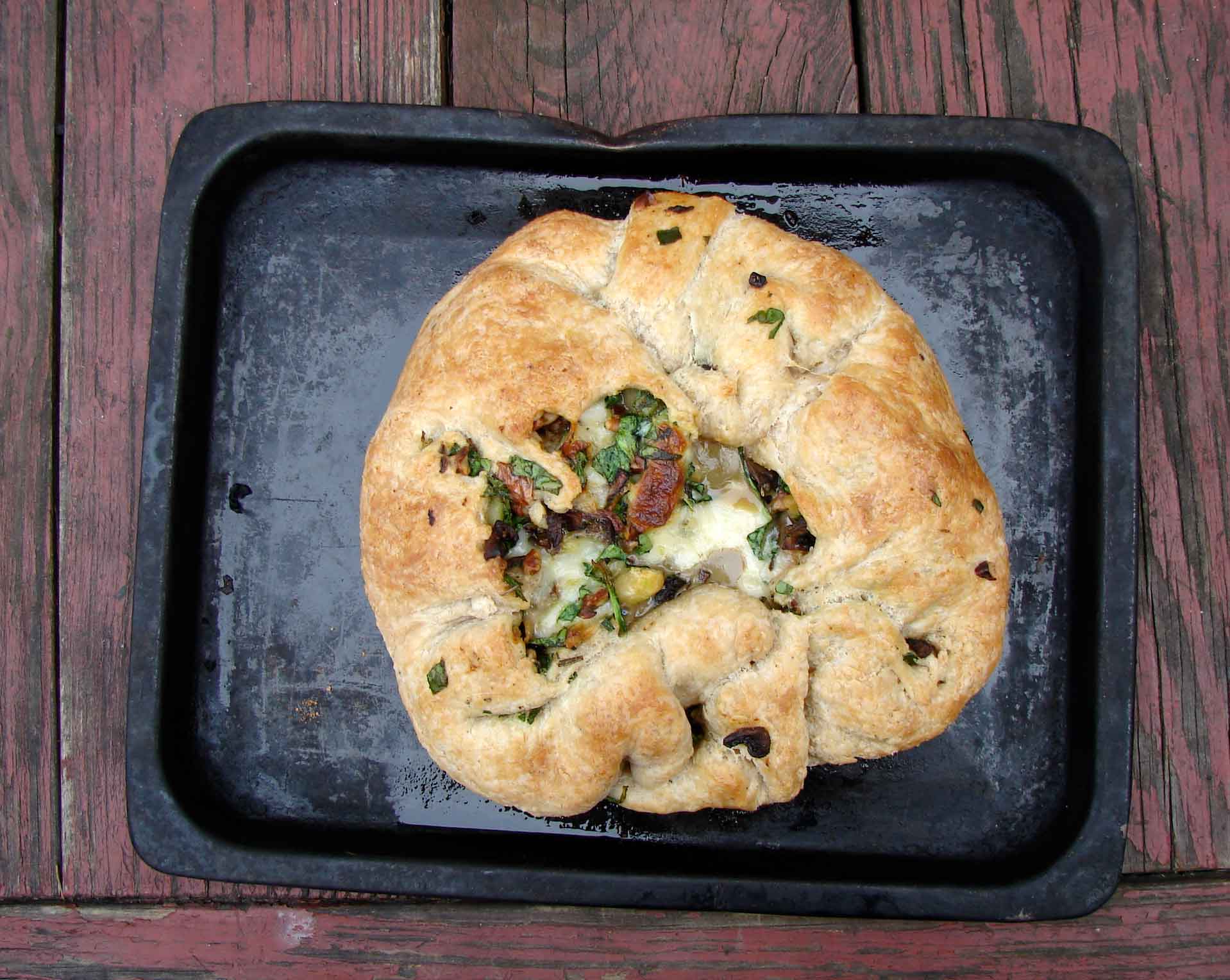 I like a rustic galette in the springtime. It’s a nice transition between the solid, nutty, beany double-crusted pies of winter and the light vegetabley open tarts of summer. You’ve got your greens and your fresh herbs, but they’re sheltered from the cool spring breezes by a touch of crust. A light jacket of crust, a shawl, maybe. This particular crust was nice and crunchy with pecans. And I flavored the filling of spinach and chickpeas with tarragon and fenugreek, because I wanted to do something different. THey’re nice together–they both have mysterious flavors, a little sweet, a little bitter. Don’t use too much fenugreek or it will take over the flavor. A pinch will do it.