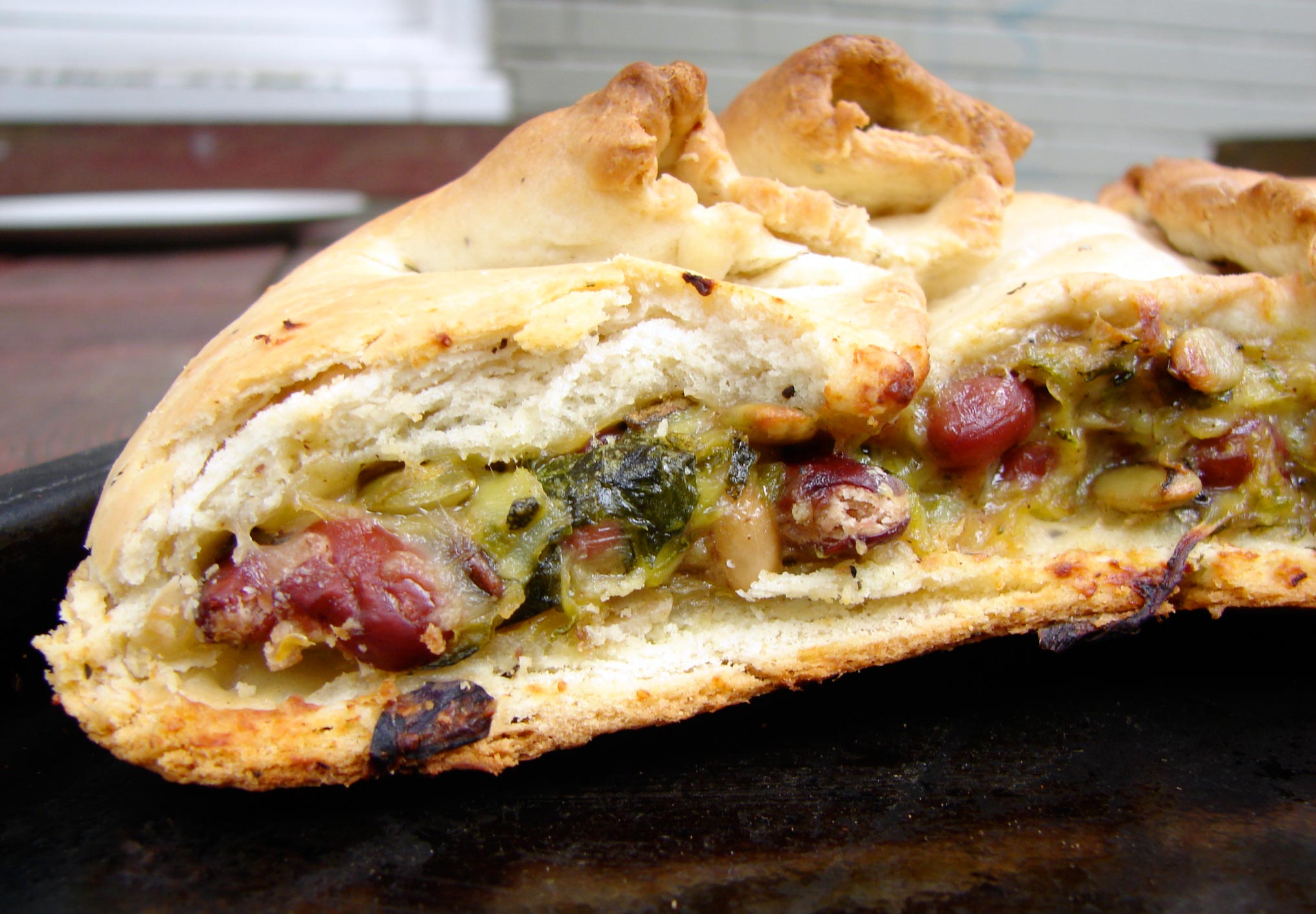When I was in Spain quite a few years ago, I stopped at a place with only one vegetarian thing on the menu – spinach, raisins, and pine nuts. It was such a simple dish, and I had such a heaping mound of spinach on my plate, but somehow it was one of the most memorable and delicious meals I have ever eaten. The filling for this pie is loosely based on that memory. I used chard instead of spinach, because of the added depth of earthy flavor, and because it seems more substantial. And I added pistachios, quite frankly, because I had them! You could just as easily use spinach and pine nuts. The flavor would be different but equally delicious. I added lemon zest to this light yeasted crust, because I think the brightness of lemon zest contrasts nicely with the earthiness of the chard.