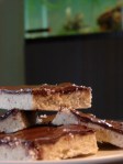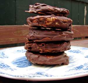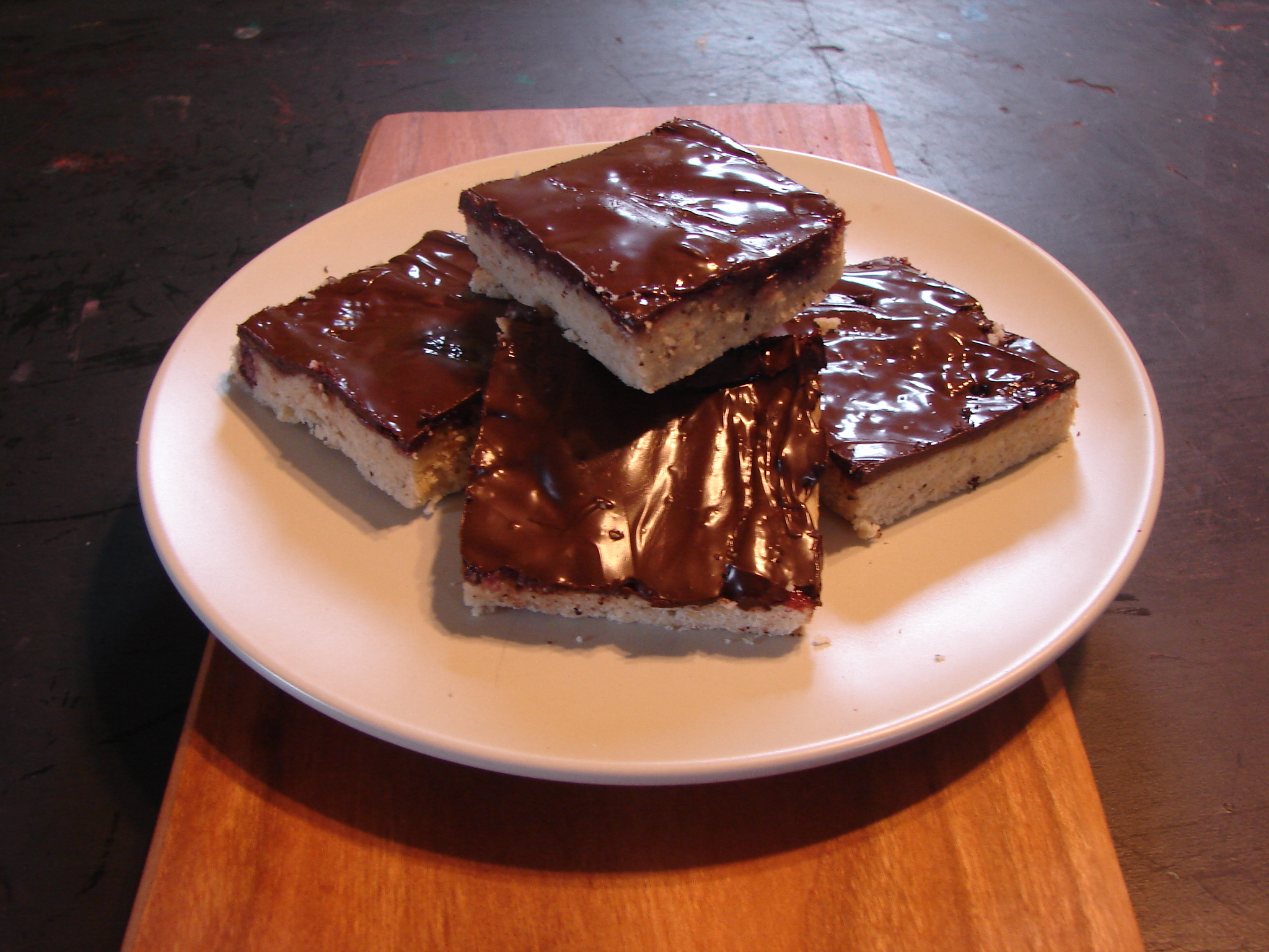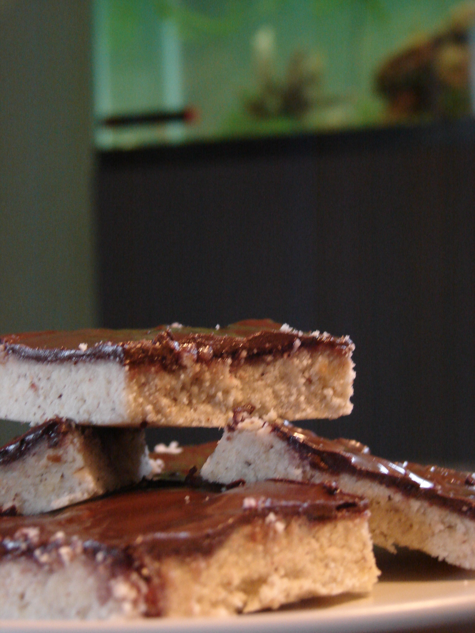 I had a meeting with a client who asked me to make a dessert for a dinner party. (Okay, so the client was my mother and the meeting was a glass of wine in the afternoon! Before pick-up at the school! Shocking!) The party was a wine-tasting featuring Argentine wines, and the maternal client requested a dessert with coconut, raspberry and dark chocolate. So I decided to make a version of Argentine-style alfajores. These little cakes are made with a subtly-flavored coconut shortbread, sandwiched together with raspberry jam, and coated in bittersweet chocolate. They also reminded me of the empire biscuits that my scottish mother-in-law makes. I think they would make a nice sweet for a holiday party, because they’re portable – you can stuff a few in your pockets and wander from conversation-to-conversation, fully stocked!!