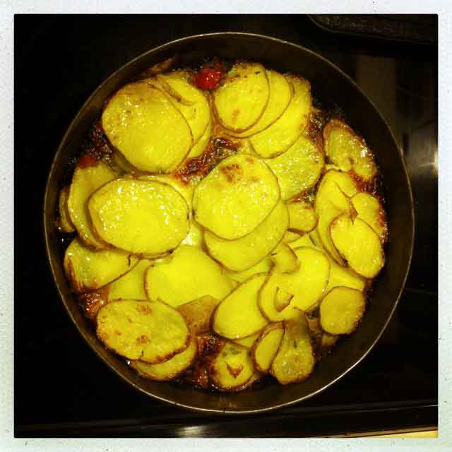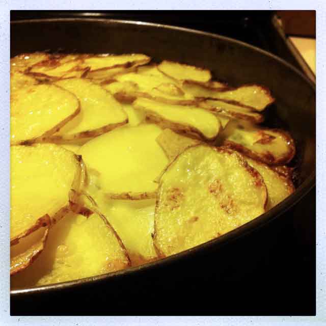I may have mentioned that I got a new food processor for Christmas. It’s a marvel! It’s so fast and quiet and efficient. I used it to slice these potatoes very thinly, and then I layered them with a sort of sauce of spinach, tomatoes, capers and olives. I also added some grated smoked gouda, but you could use mozzarella or goat cheese or leave the cheese out altogether and this would be vegan. I made mine quite shallow in a big French cake pan, but you could make it with more layers in a deeper pan. You might need to cook it longer, though.