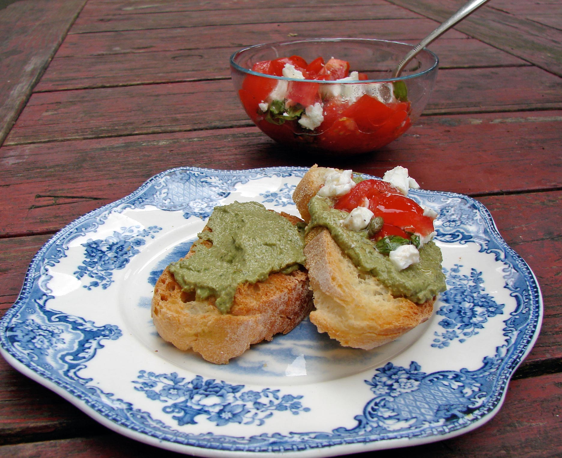 I made a soup with lettuce, hazelnuts and white beans. I seasoned it with tarragon, chervil, and lovage, and it was very flavorful. It was smooth, but not velvety, although you could certainly make it that way if you liked. I floated a small, plain toast in it, and it was delicious. The other non-salad lettuce item on the agenda was a lettuce, pumpkinseed, goatcheese pesto. It turned out very nice! Much milder in flavor than a traditional basil pesto, but it has the lovely, indefinable flavor of toasted pumpkinseeds, and a bit of creamy tang provided by goat cheese. We ate it with toast (again!) and a little bruschetta topping made from tomatoes, basil, french feta, and capers.