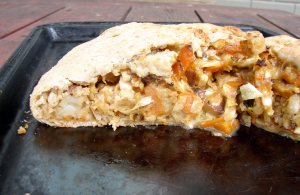 I have some cabbage from the CSA. I decided against stuffing it with klondike bars and lard, and opted instead to make a galette. I wanted it to be sweet and cripsyish, but also soft and comforting. I like cabbage when it’s very lightly cooked, so that’s how I approached this galette. I made a walnut crust (surprise!) and threw a few handfuls of toasted walnuts into the filling as well, for crunch. I was determined to add potatoes to the filling, and so I did, after frying them in olive oil. They were lovely! I flavored it with tamari (in a nod to moo shoo vegetable, which is one of the few cabbage dishes I like), white wine, and basil, tarragon, and thyme. I think it turned out really tasty! David liked it, too, and he’s not a fan of cabbage in any form. Score!! It’s not the prettiest thing you’ll ever make, so serve it with something colorful and crunchy, like a crispy salad with lots of fresh tomatoes and basil.