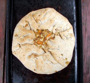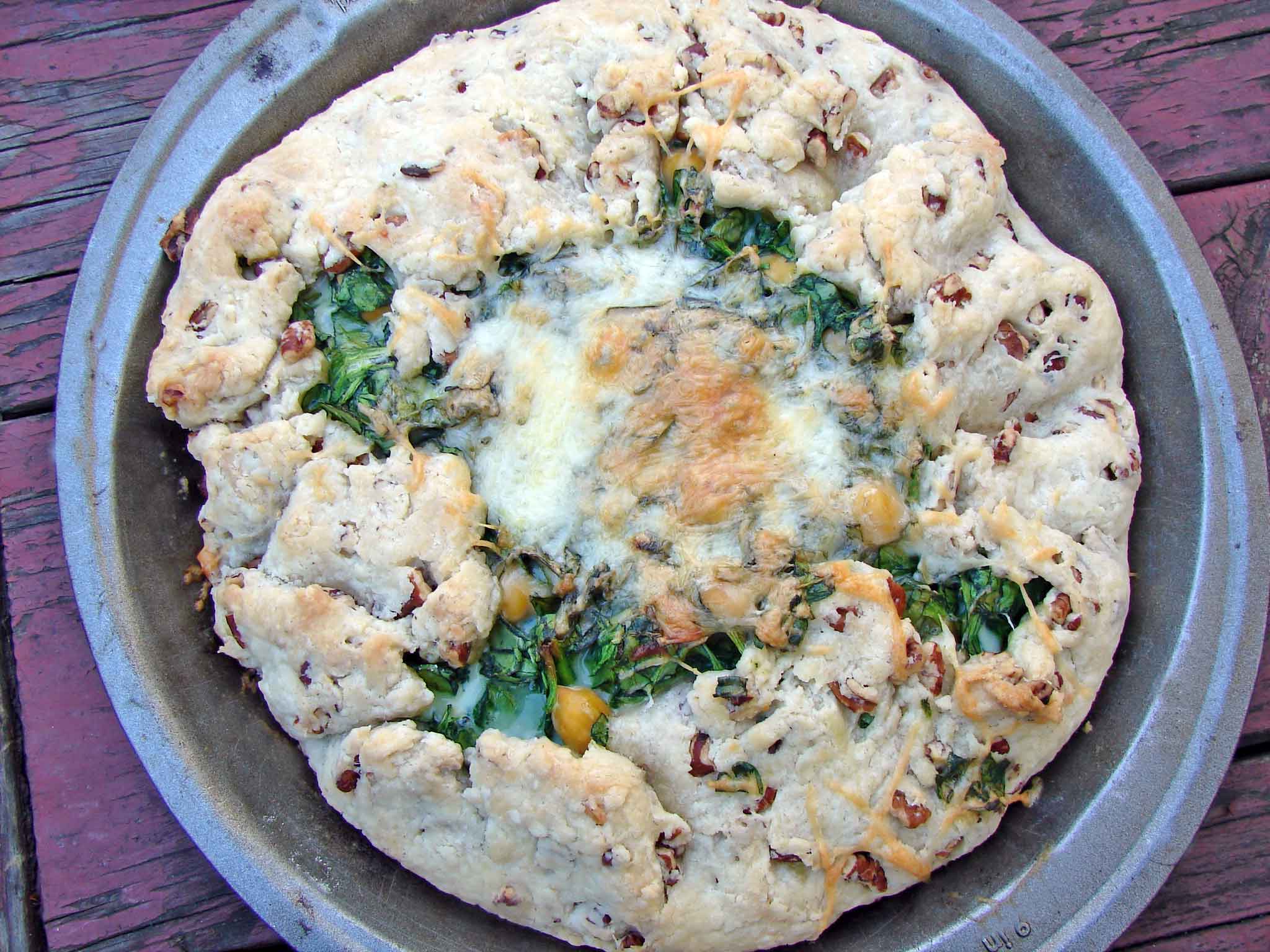 I like a rustic galette in the springtime. It’s a nice transition between the solid, nutty, beany double-crusted pies of winter and the light vegetabley open tarts of summer. You’ve got your greens and your fresh herbs, but they’re sheltered from the cool spring breezes by a touch of crust. A light jacket of crust, a shawl, maybe. This particular crust was nice and crunchy with pecans. And I flavored the filling of spinach and chickpeas with tarragon and fenugreek, because I wanted to do something different. THey’re nice together–they both have mysterious flavors, a little sweet, a little bitter. Don’t use too much fenugreek or it will take over the flavor. A pinch will do it.