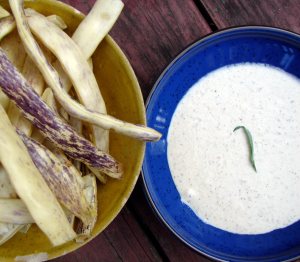 This almond tarragon sauce is another version of a tarator sauce. I made it to go with some very pretty dragon’s tongue beans, which I lightly steamed. But I ate it for days afterwards – with every kind of vegetable, with empanadas, on salads. It’s a nice creamy, cream free dressing. Very good with roasted beets!
